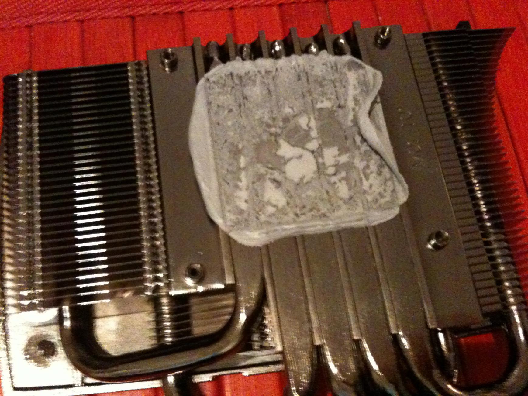 Das die GTX480 mit dem MK-13 @idle nochmal eine Ecke leiser geworden ist, spielt keine besonders große Rolle, da der Referenzkühler sich hier schon recht moderat verhält. @load glaubt man dann irgendwie nicht wirklich, dass es sich um die gleiche Grafikkarte wie vorher handelt. Ich habe mit dem Originalkühler locker Drehzahlen von 4000rpm(!) erreicht, was auf die Dauer natürlich stört. Ich denke auch, dass diese Drehzahlen z.T. der meiner Meinung nach viel zu dicken Verarbeitung der Original-WLP geschuldet waren (siehe pic).
