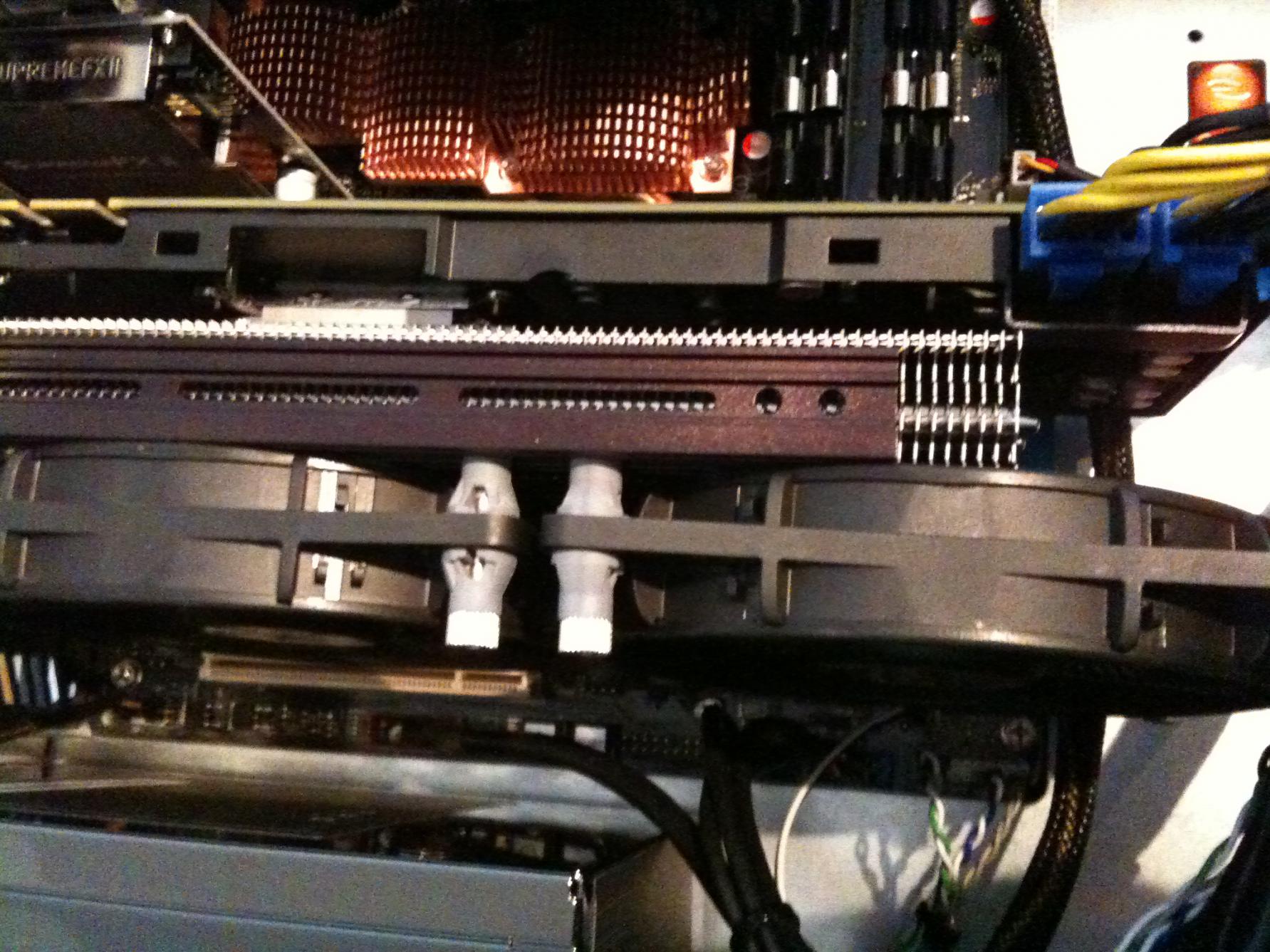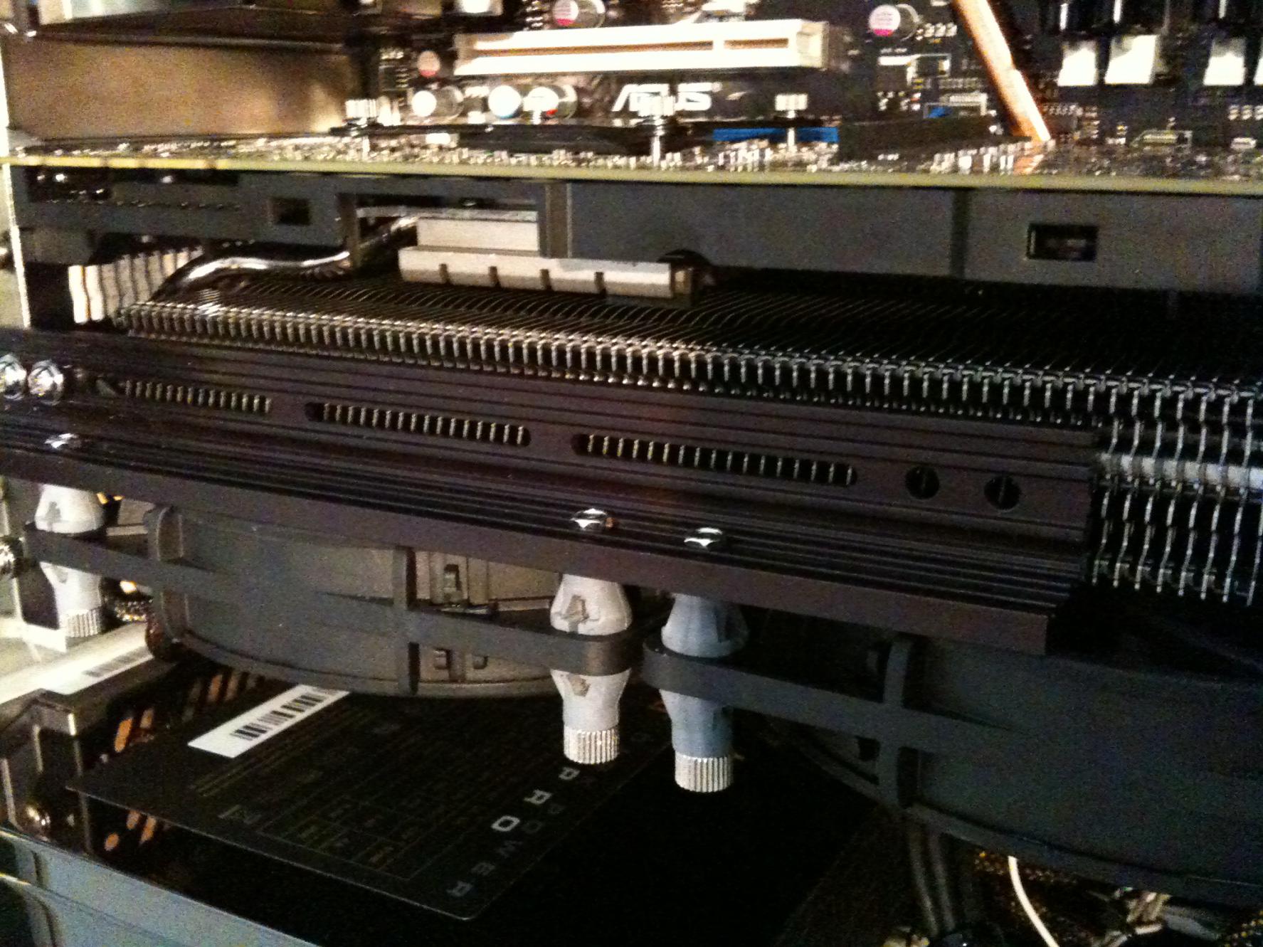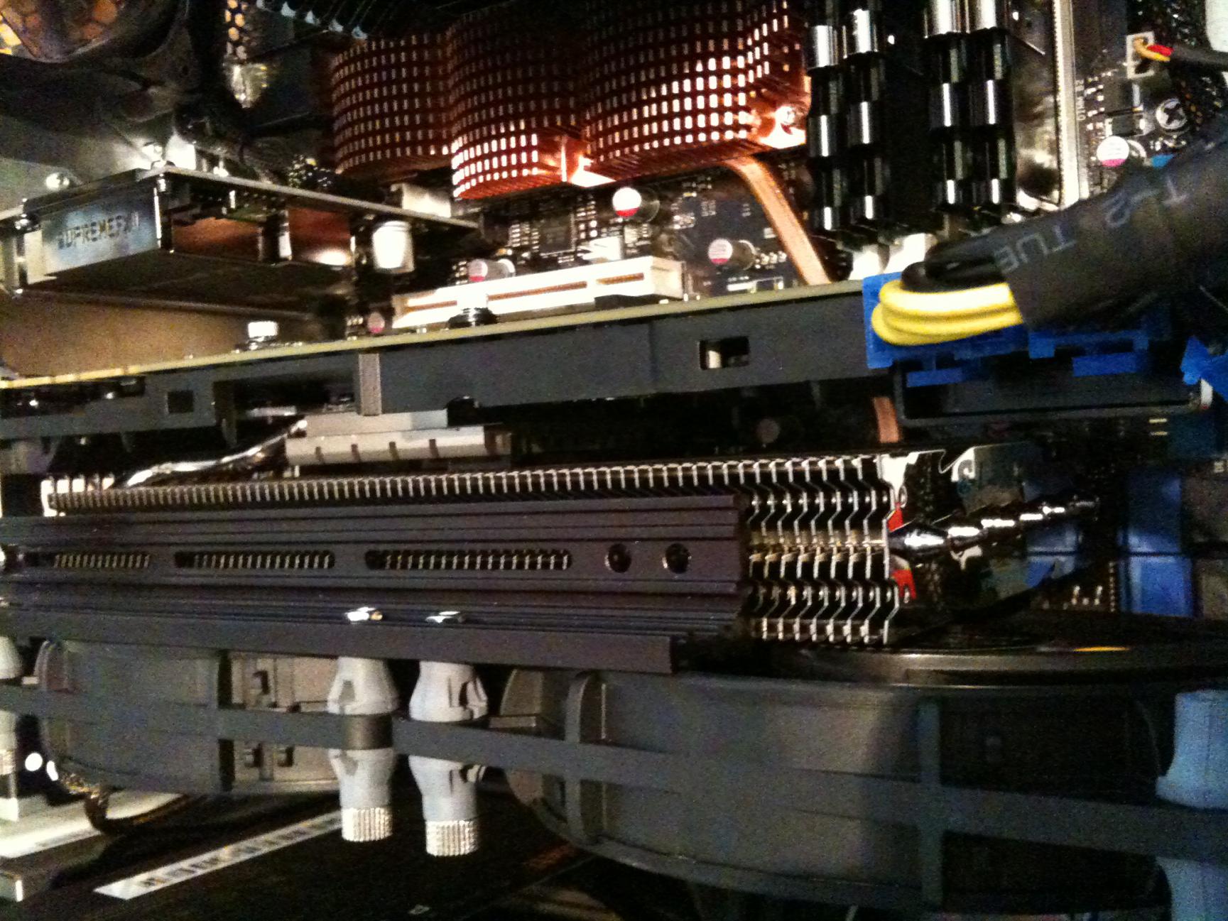 So, etwas Neues von mir. Da ich mit der Lüfterkonfiguration überhaupt nicht zufrieden war, habe ich doch noch auf den Aufbau "zwei Lüfter unterhalb des MK-13" umswitchen können. Dazu wanderte der Befestigungsadapter einen slot nach oben und die USB-ports störten nicht mehr (war wohl gestern nicht mehr aufnahmefähig, warum denn nicht gleich so?