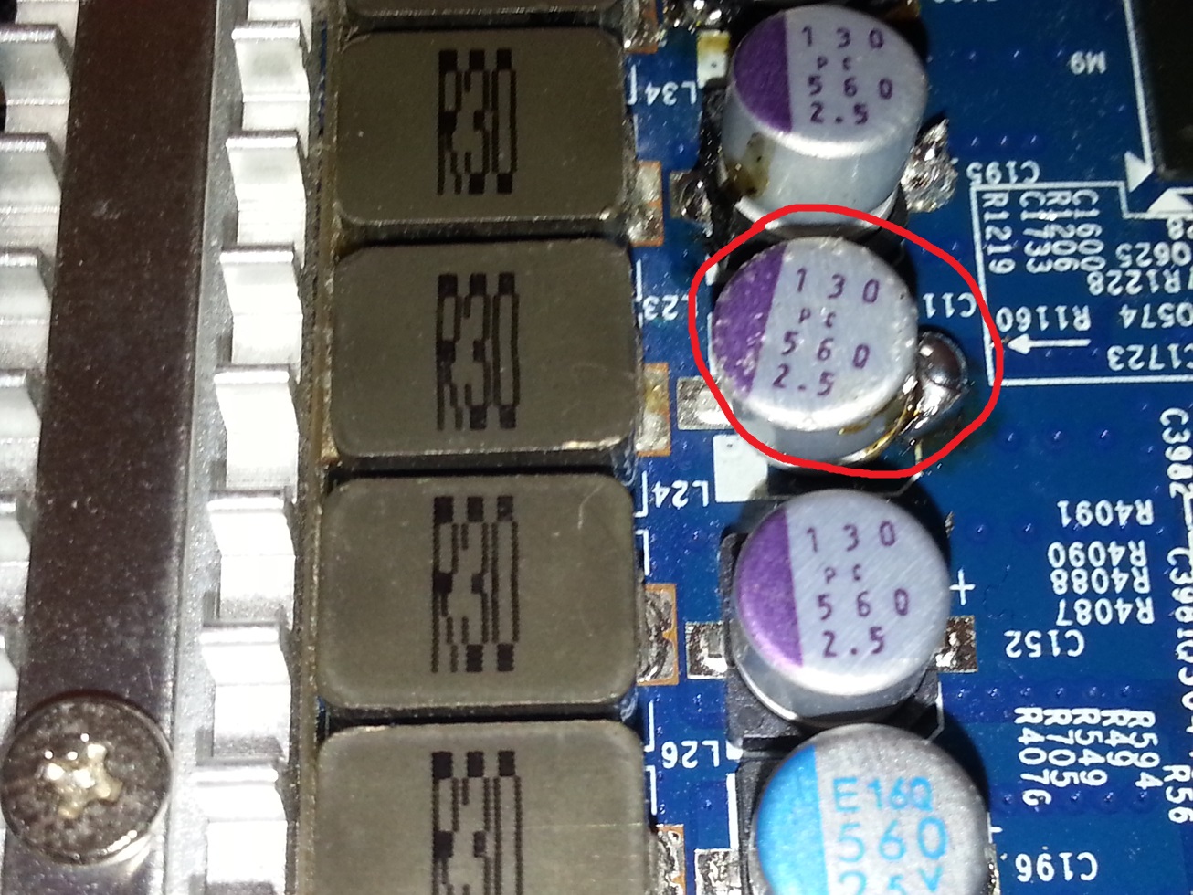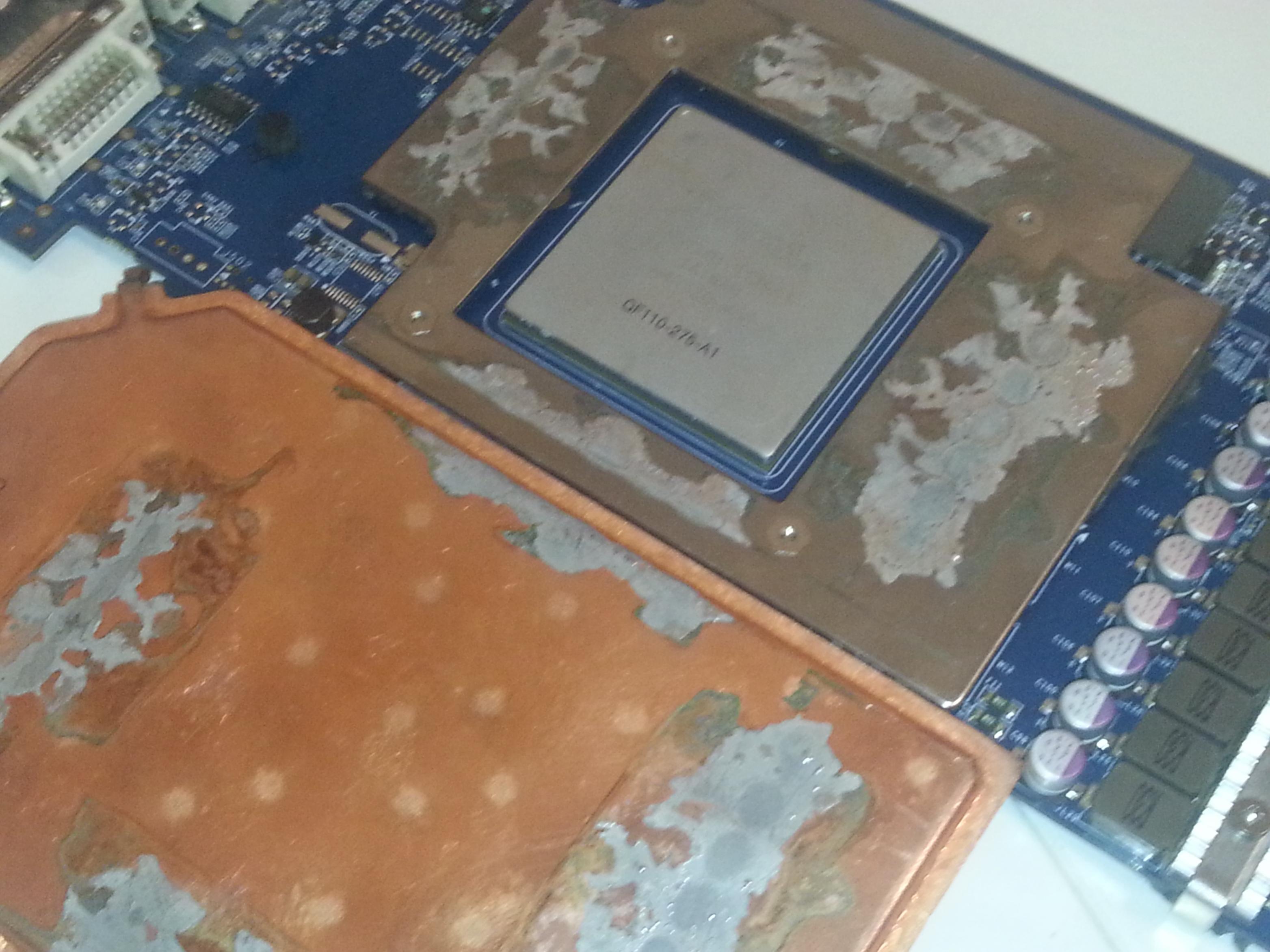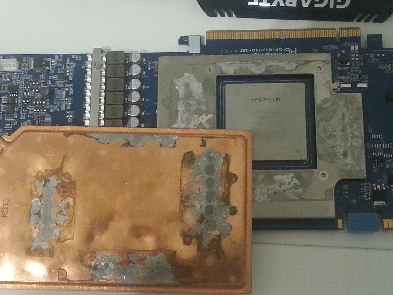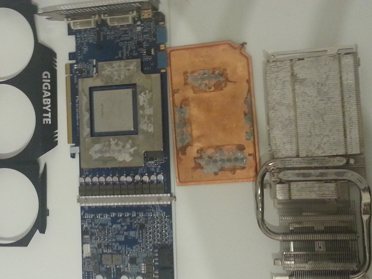Also aufgeschraubt und siehe da der komplette Kühler hat sich von der Grafikkarte gelöst und lag in 3 teilen mit geschmolzenem Lötzinn am PC boden.