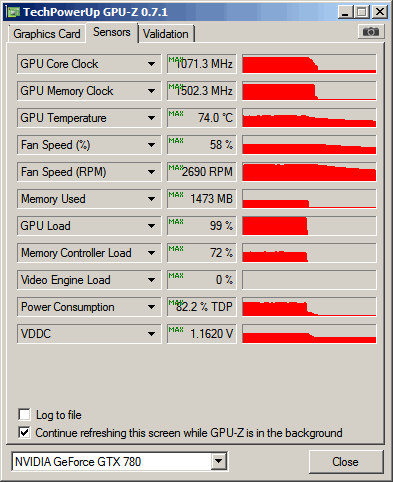 Auf 74°C kommt die Karte bei mir unter normalen Bedingungen (Zimmertemp. 22 °C) wenn ich die Drehzahl fest auf 2000 Umdrehungen einstelle, noch weiter runter wäre auch kein Problem.