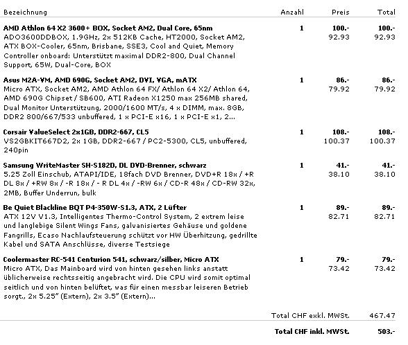 Falls es wirklich länger halten soll, würde ich ein paar euro mehr in die CPU investieren. Ein C2D E4300 is ja nu auch nich mehr teuer, hat doch noch einiges mehr an Performance als ein X2 3600+ bei gleicher Leistungsaufnahme. Dazu 2GB DDR2-667 und ein Board mit integrierter Grafik. Da ein ArbeitsPC ja auch möglichst leise sei soll, würde ich mir noch diesen günstigen und leisen CPU-Lüfter gönnen: http://www.idealo.de/preisvergleich/OffersOfProduct/340255_-freezer-7-pro-arctic-cooling.html