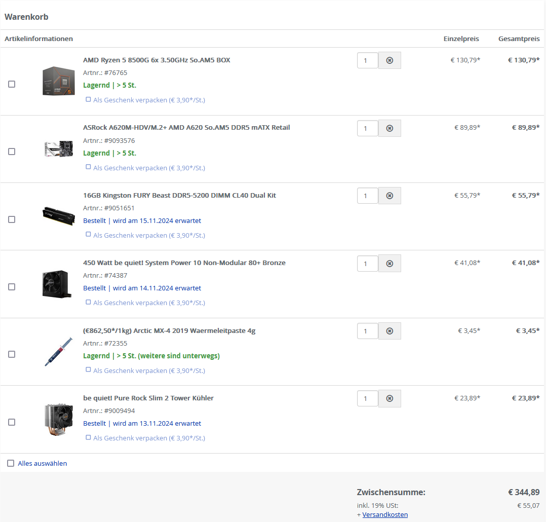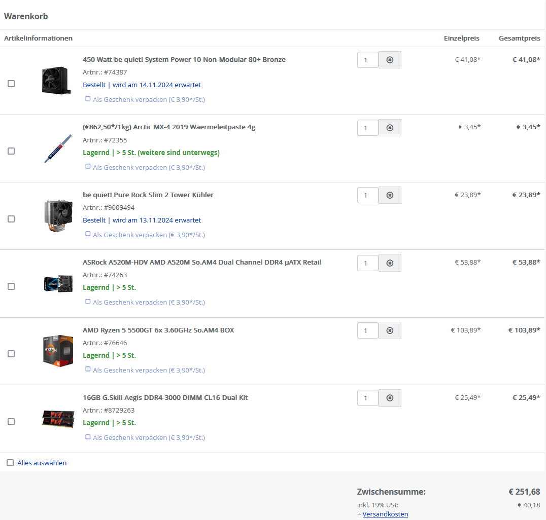 Das aktuelle Gehäuse (Midi-Tower, war damals was günstiges) kann weitergenutzt werden und von mir bekommt er eine aktuell ungenutzte SSD, sodass diese beiden Punkte nicht benötigt werden.