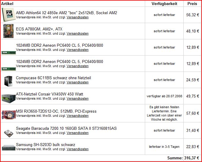 Will mir nen neuen Rechner leisten und will nicht mehr als 350€ ausgeben , 370€ ist absolutes Maximum. Muss kein High End Rechner sein, aber für Race Driver Grid , Colin Mcrae Rally oder Sega Rally auf 1280x1024 in 4xAA und auf High sollte er schon reichen. Hab mir bei Hardwareversand was zusammengestellt, nur kenn ich mich mit Mainboards so gar nicht aus. Ich will vorallem nicht overclocken ! Lautstärke ist ebenso egal ! Hab einfach drauf geschaut, dass das Mainboard DDR2800 hat , SATAII und IDE.