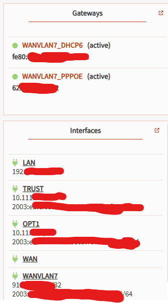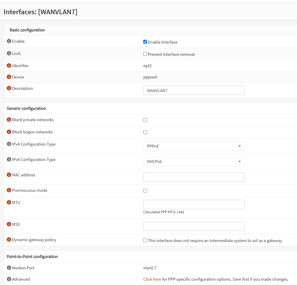 1. Meine WAN-Verbindung wird ja über ein VLAN 7 hergestellt, da die Telekom dieses fordert und da mir sowieso nichts anderes übrig blieb, da mein Router (NUC) ja nur einen LAN-Port hat. Nun ist es so, dass ich bei sämtlichen Port Forwardings oder Outbound NAT-Rules statt WAN (wie in den meisten Tutorials angegeben) das PPPoe-Interface verwenden muss. Ist das so korrekt, oder habe ich etwas falsch konfiguriert? Das PPPoE-Interface erhält die öffentliche IP der Telekom. Habe bilder vom WAN- und PPPoe-Interface und von einer beispielhaften Portfreigabe auf meinen Home-Assistant angehängt.
