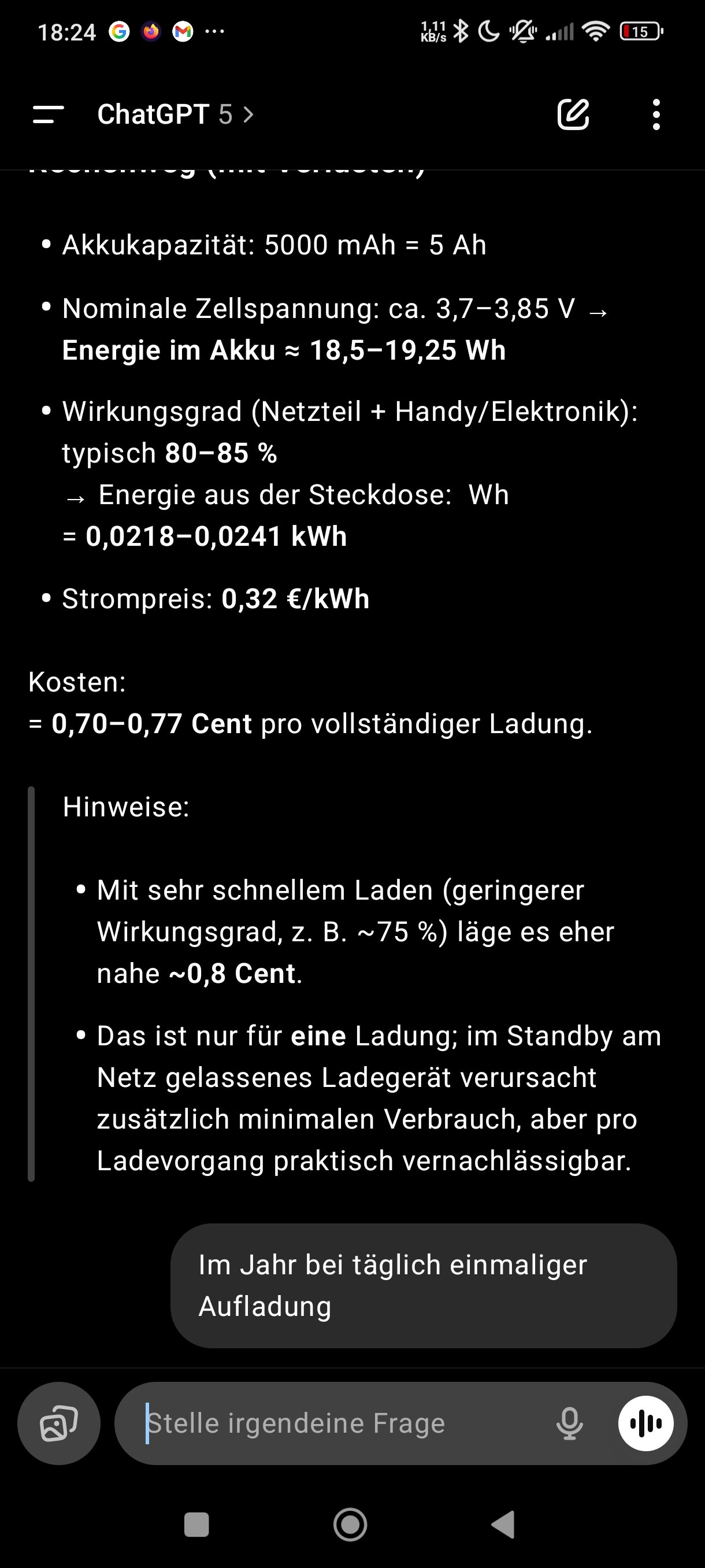 Pro Ladezyklus der Powerbank können wir also 3 Smartphone-Ladungen durchführen, was normalerweise 3 × 0,76 Cent =