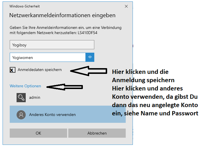 Login des Benutzers (s.o.) eingeben (ggfs als Benutzer "192.168.123.1\benutzervonoben" eingeben)