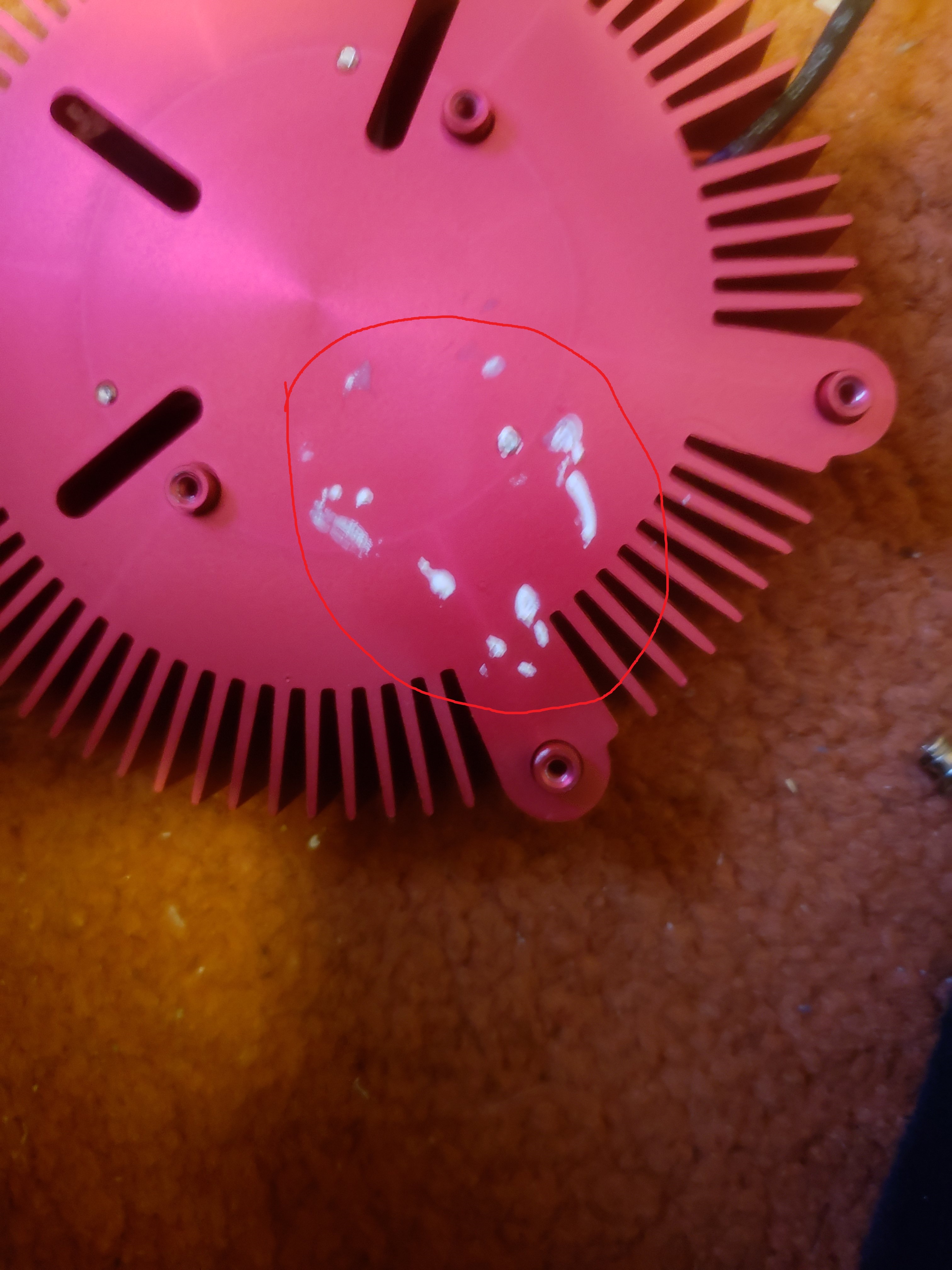 Notiz: Sollte die WLP sich hier von Werk aus schlecht verteilt haben oder viel zu dick sein (Siehe Bild 2+3), steht vermutlich eine der Lüfterschrauben über. Dies kontrollieren und bei Bedarf die entsprechende Schraube etwas lockern.