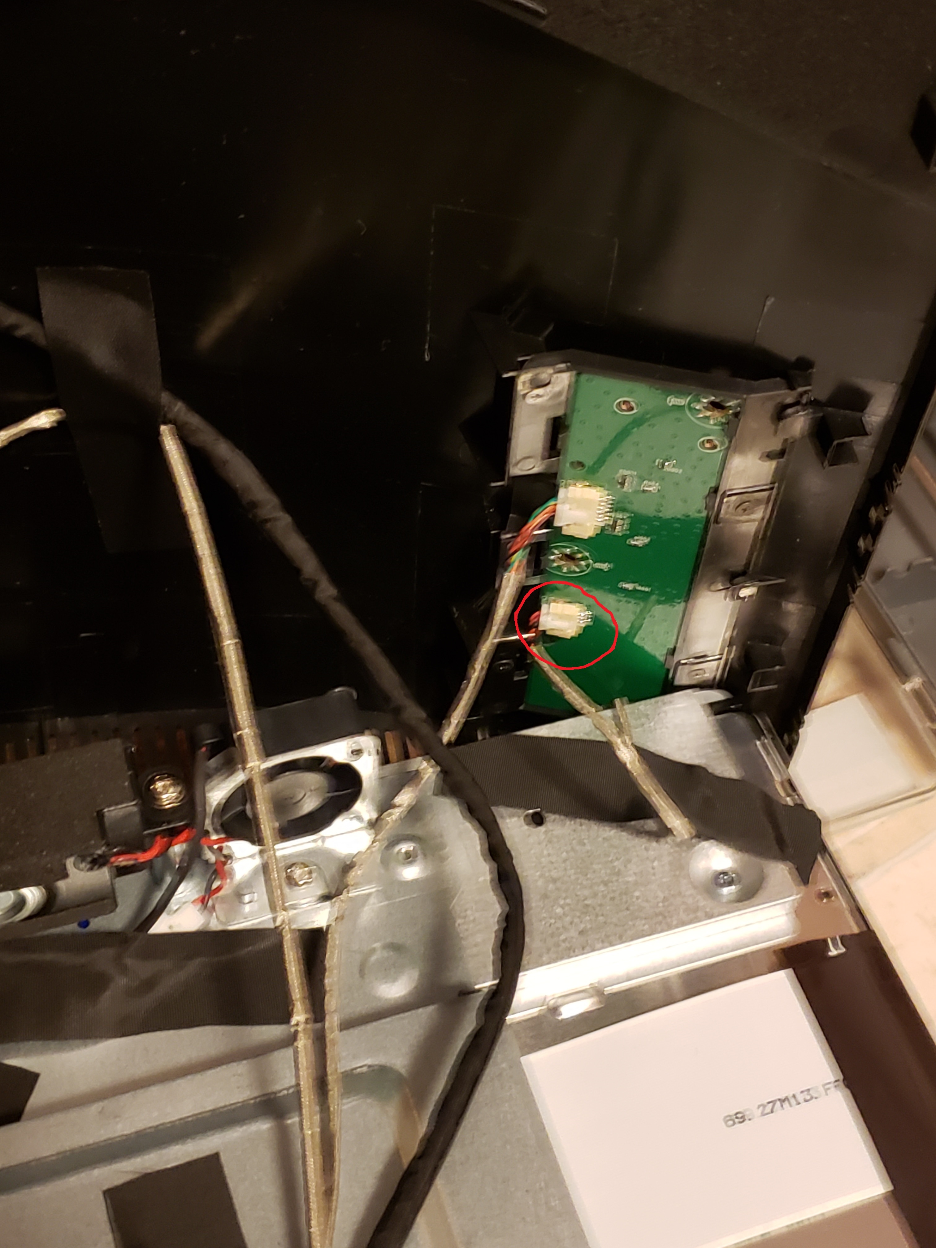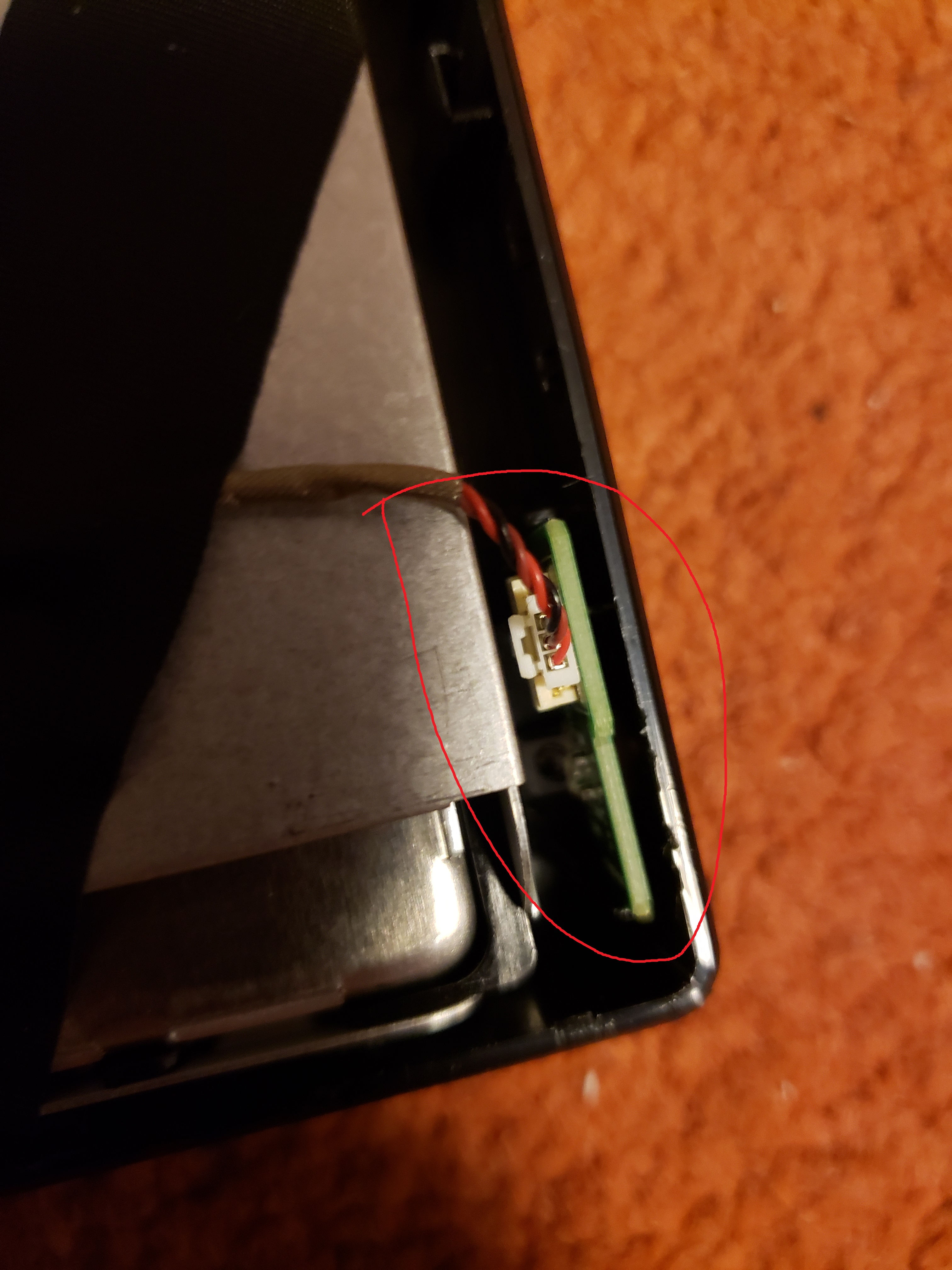 Dann den rot markierten Anschluss auf der Rückseite lösen. (Es handelt sich um den Anschluss für die Power-Led)