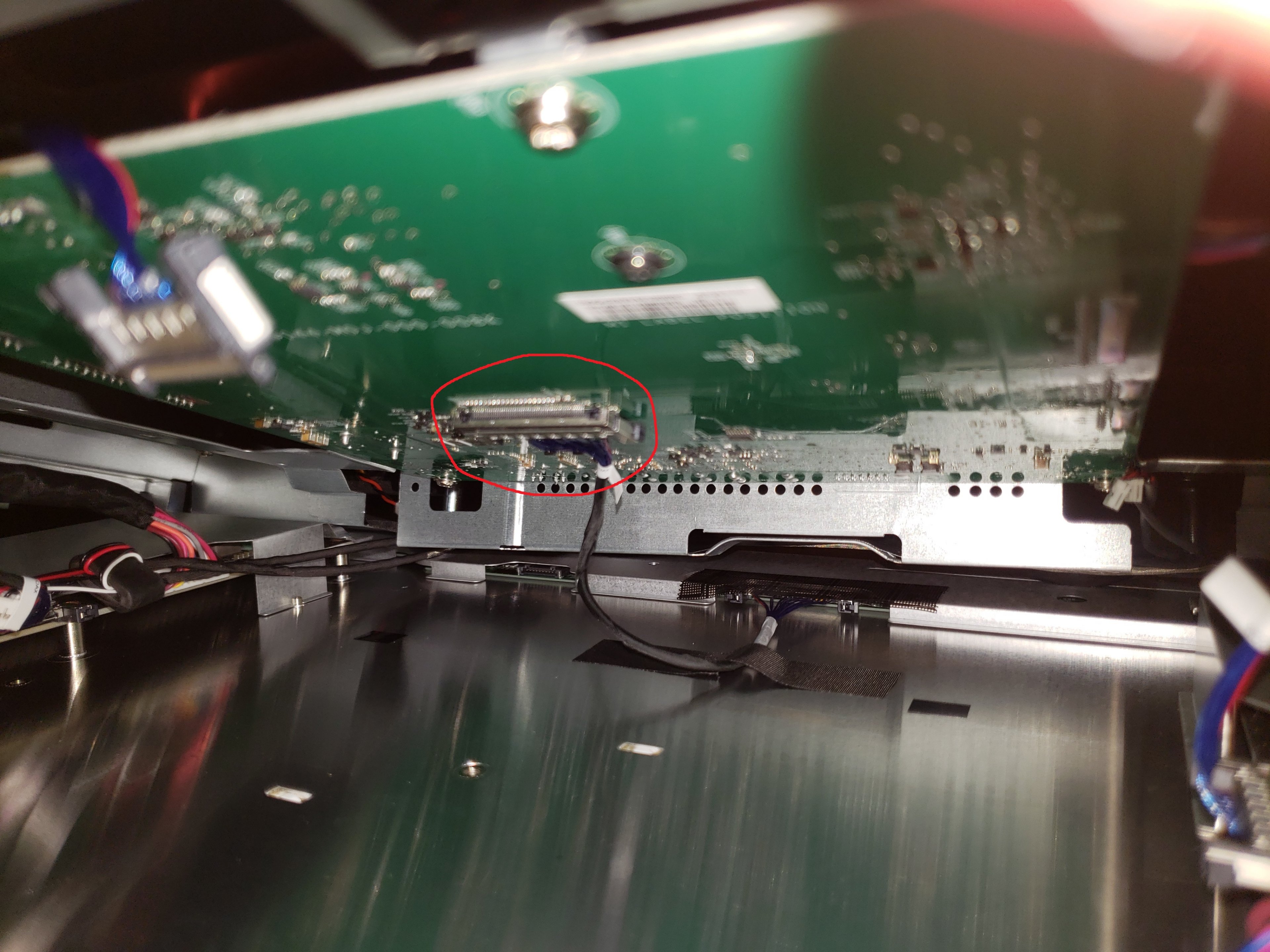 1.6 Die zu sich zeigende Seite (die ohne Monitoranschlüsse) langsam anheben, anschließend den rot markierten Anschluss lösen (Es handelt sich um einen Anschluss für das Display)