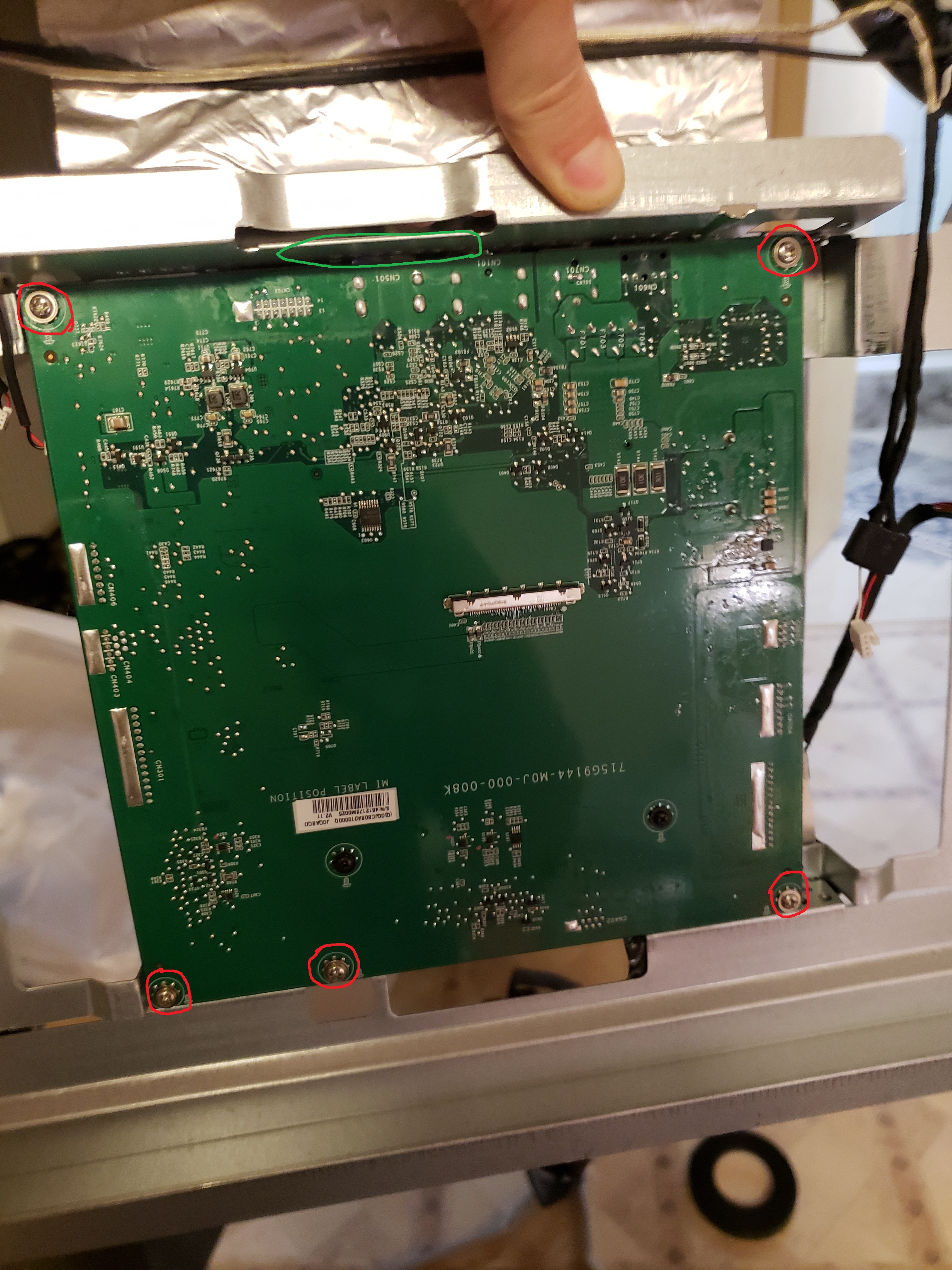 Weiterhin befindet sich an der grün markierten Stelle, bei den Displayanschlüssen, noch eine weitere Schraube - siehe rot markiert Bild 2, diese ebenfalls lösen.