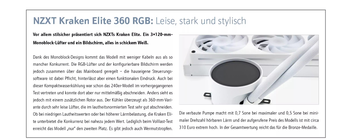 Optisch ansprechend finde ich die NZXT KRAKEN Plus V2 360 RGB (würde ja auch zum NZXT H9 Flow passen). Leider habe ich dazu keine Reviews gefunden. Die Kühlleistung und Lautstärke sind mir am Wichtigsten.