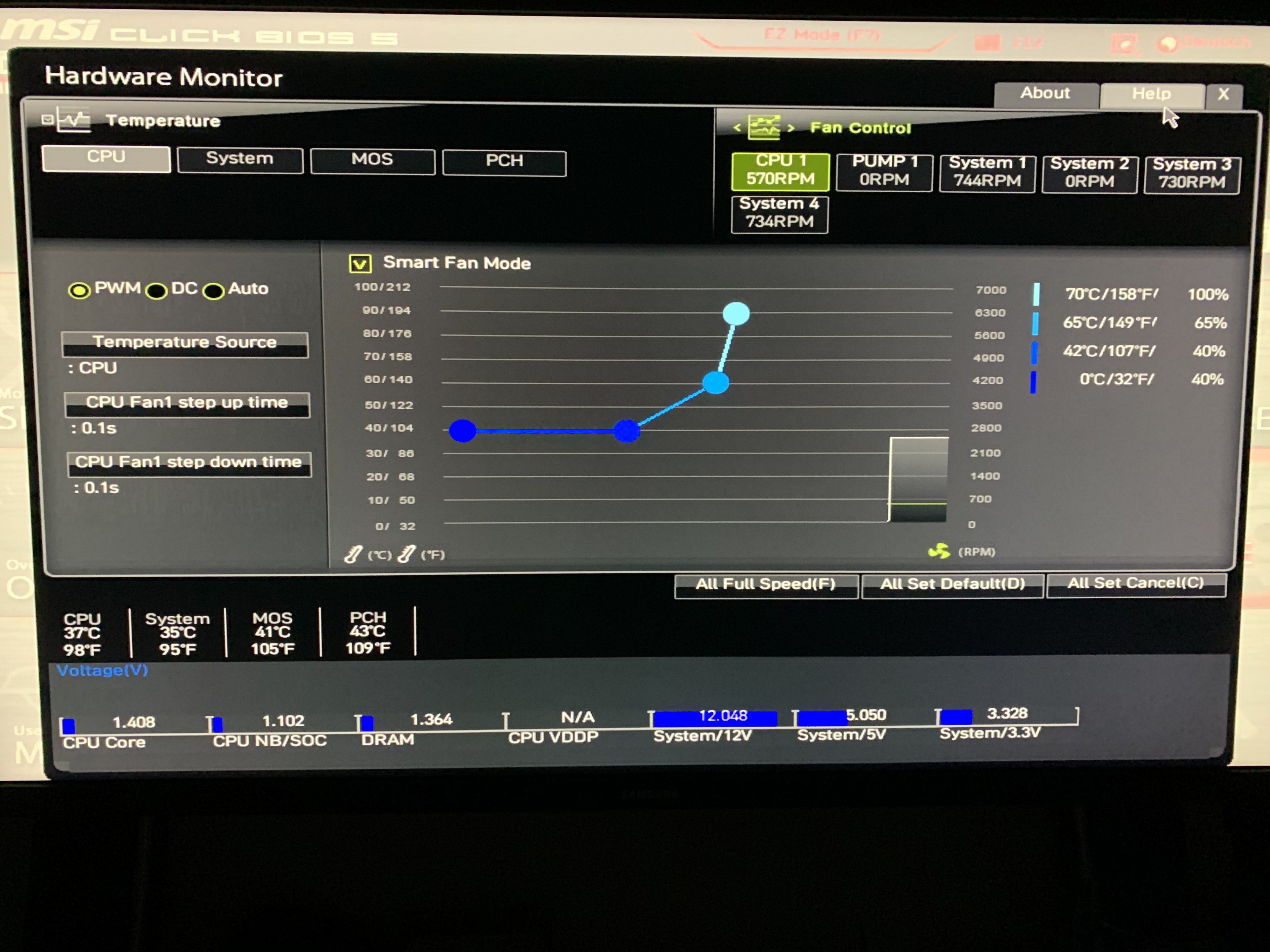 Ich hab mich etwas vertan, ich hab angenommen dass der Lüfter hinter dem CPU kühler der PUMP1 wäre, der der so einen Krach macht, aber es ist der an der Decke. Der lässt sich auch nicht auf eine feste Umdrehung machen sobald ich Smart Fan Mode deaktiviere, d.h. ich kann eigentlich nur die Graphen verschieben. Soll ich dann einfach mal versuchen, alle Graphen niedrig zu verstellen?