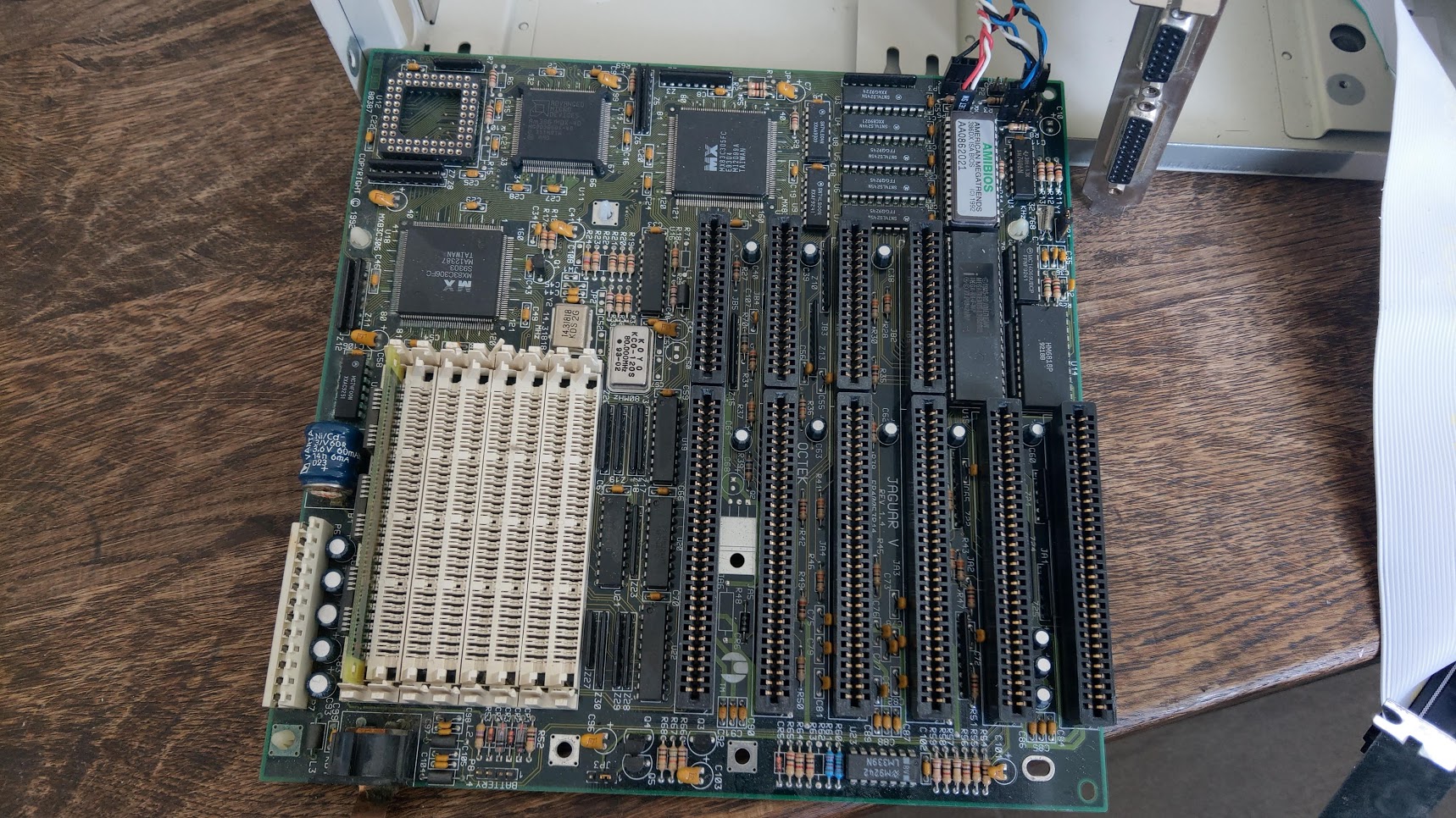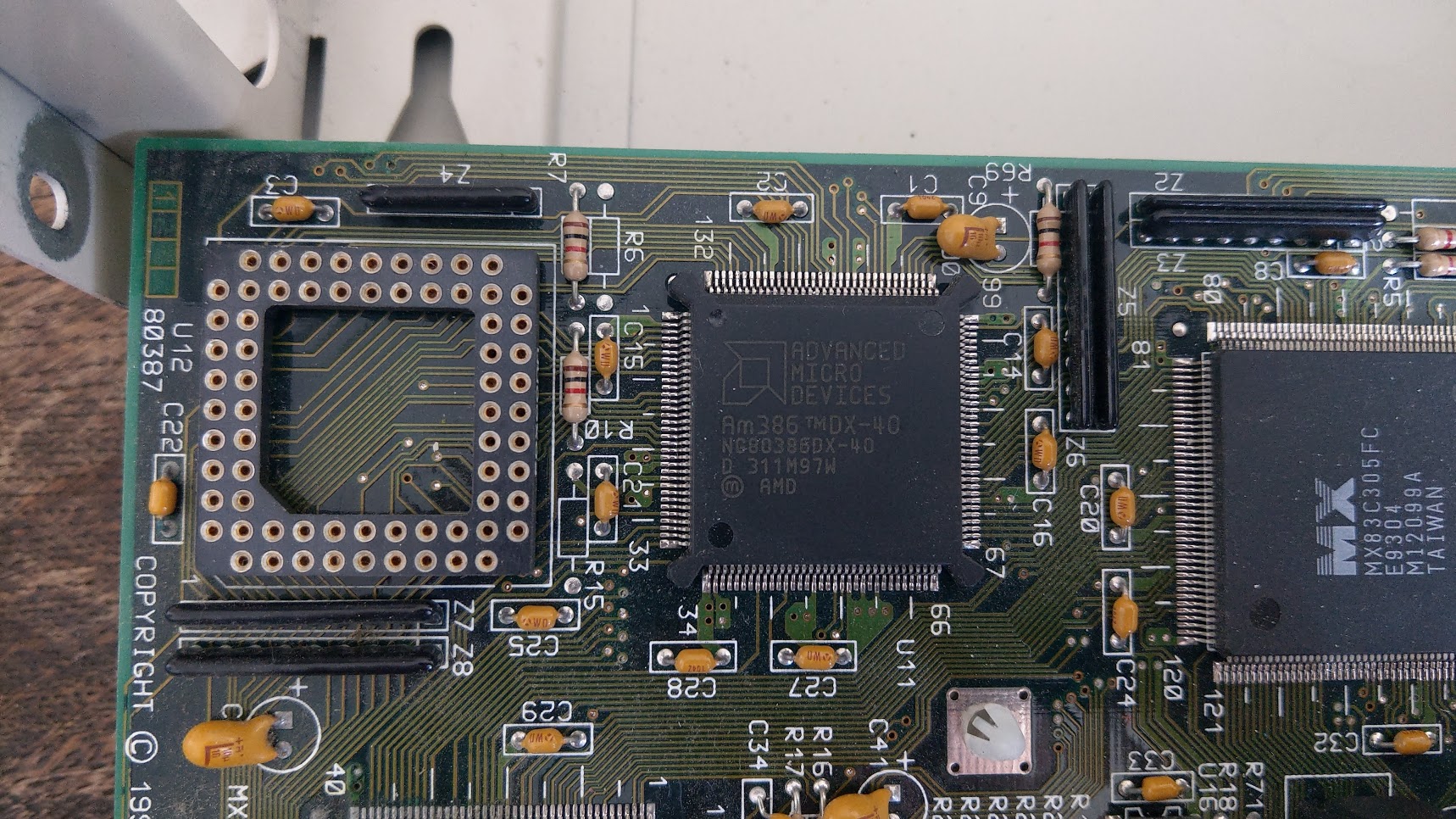 Die AMD CPU AM386-DX steckt unter dem Kühlkörper, in den freien Sockel könnte man noch einen IIT 4C87DLC-40 als Mathe Co-Prozessor stecken. Der 3,6V 60mAh Bios-Stützakku fehlt und würde normal an der freien Stellen direkt neben dem AT-Anschluss sitzen.