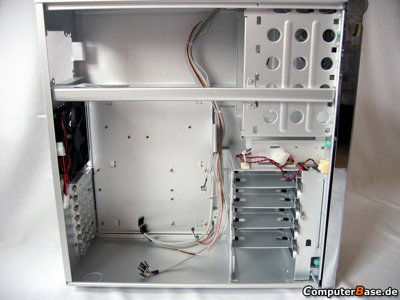 Das Gehäuse hat Platz für 2 120mm Lüfter (einer hinten, einer vorne direkt vor dem Festplattenkäfig).