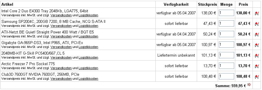 Es war sogar eine 7600GT drin. Zudem musst du dir noch ein Laufwerk und Gehäuse aussuchen.