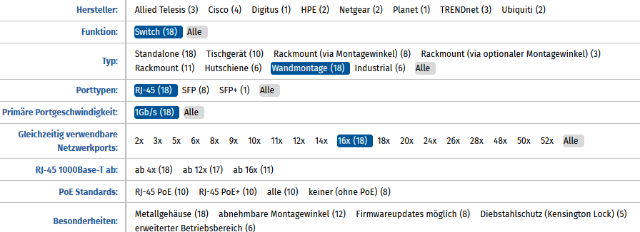 Ich benötige jetzt einen neuen mit 16 Ports. Ich habe gehört, dass es auch welche gibt, die die Entfernung messen können, bis wo ein Kabelproblem besteht. Mein 3Com hat sich nämlich ca. 1x am Tag von 1000Mbit auf 100Mbit umgestellt auf einer Strecke(1 Port). Das hat man dann natürlich gemerkt. Dann Kabelraus, Kabel rein - oder Switch aus, Swtich an & es war wieder 1000Mbit verfügbar.