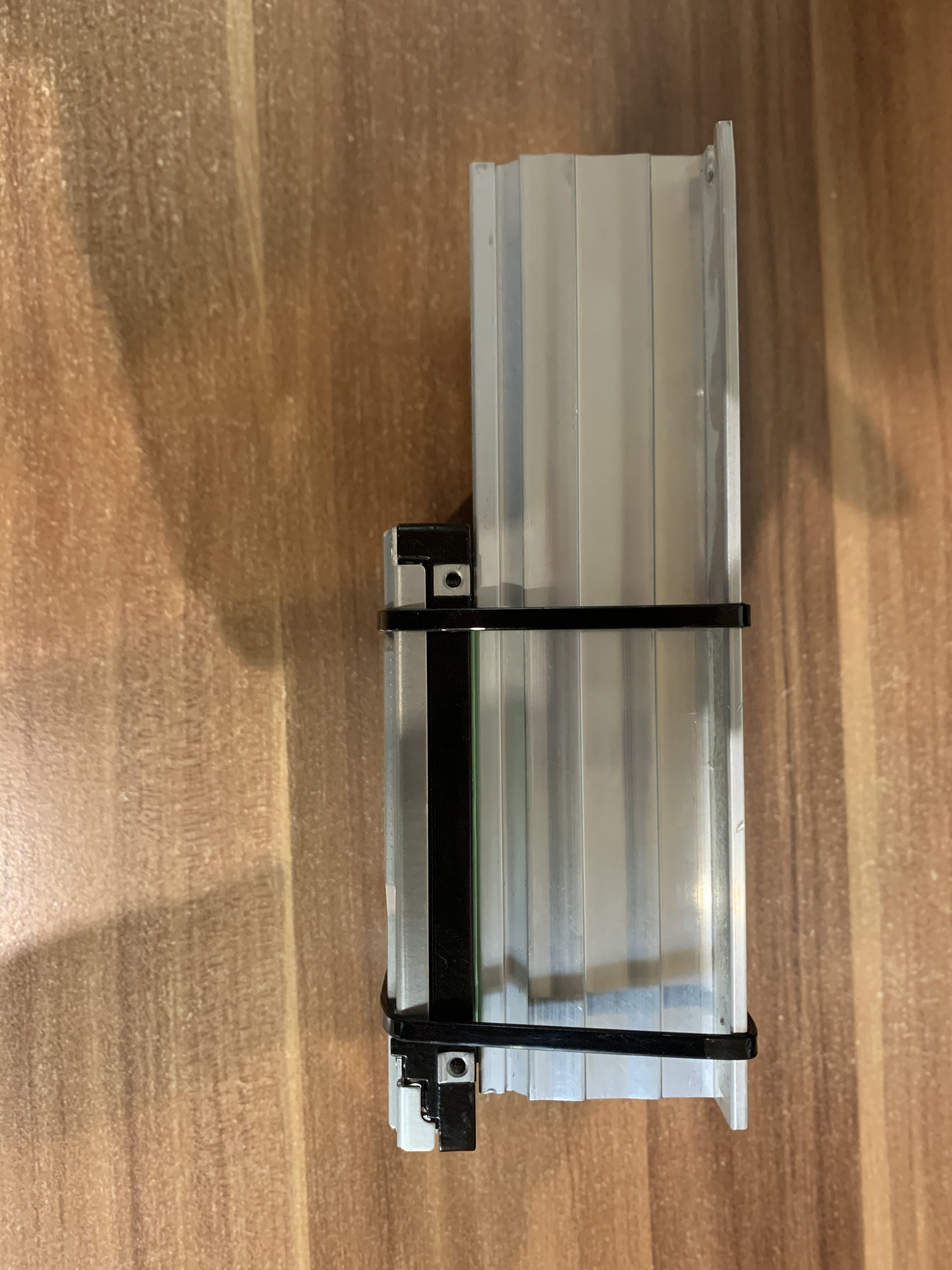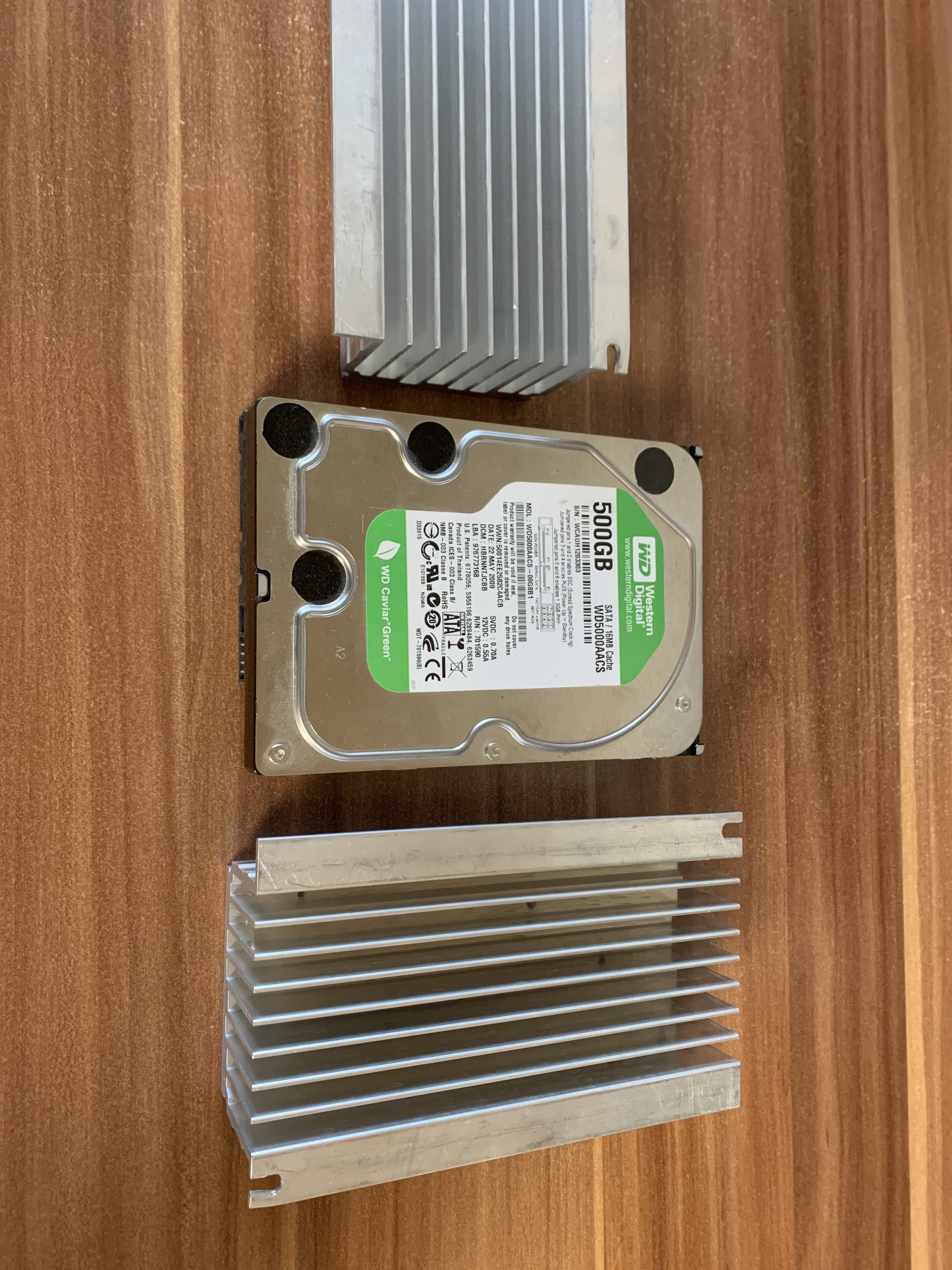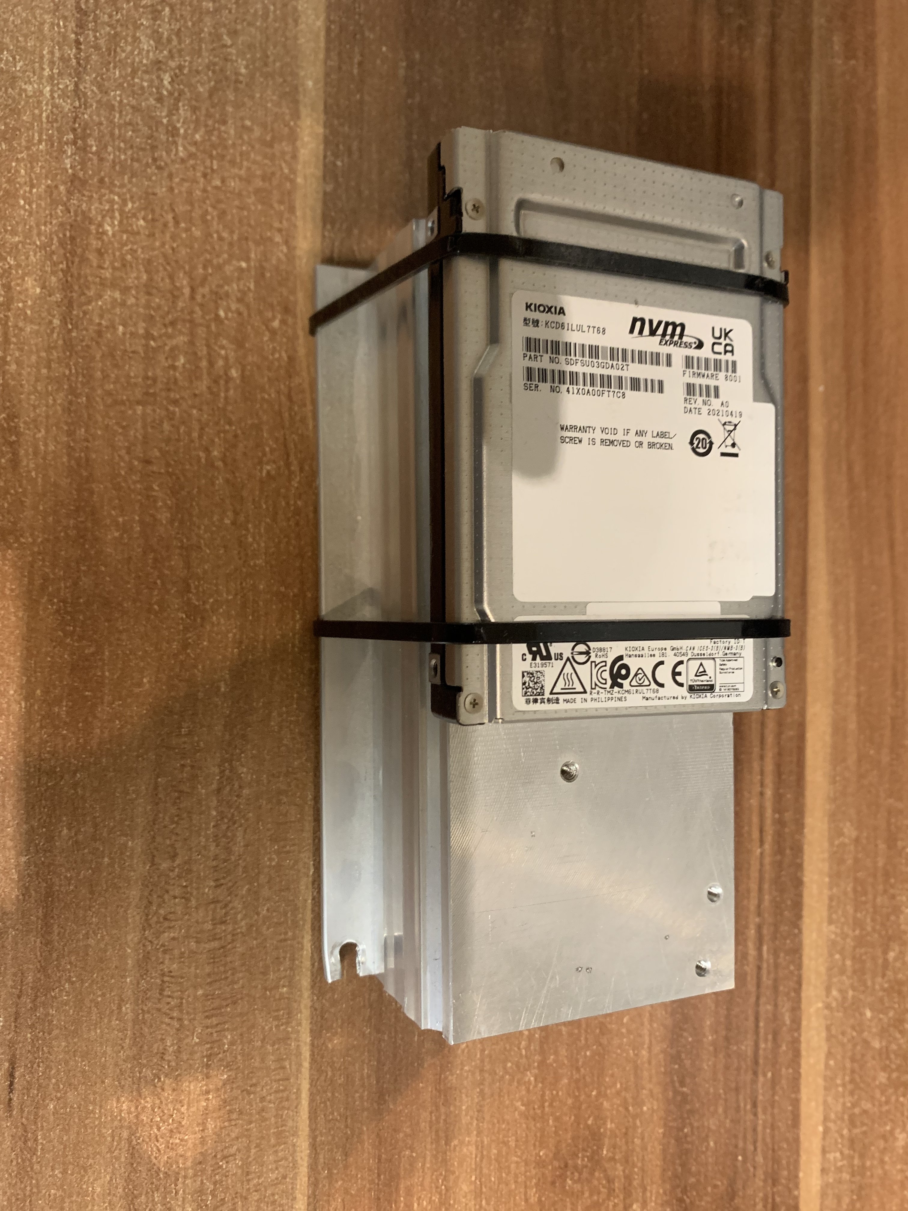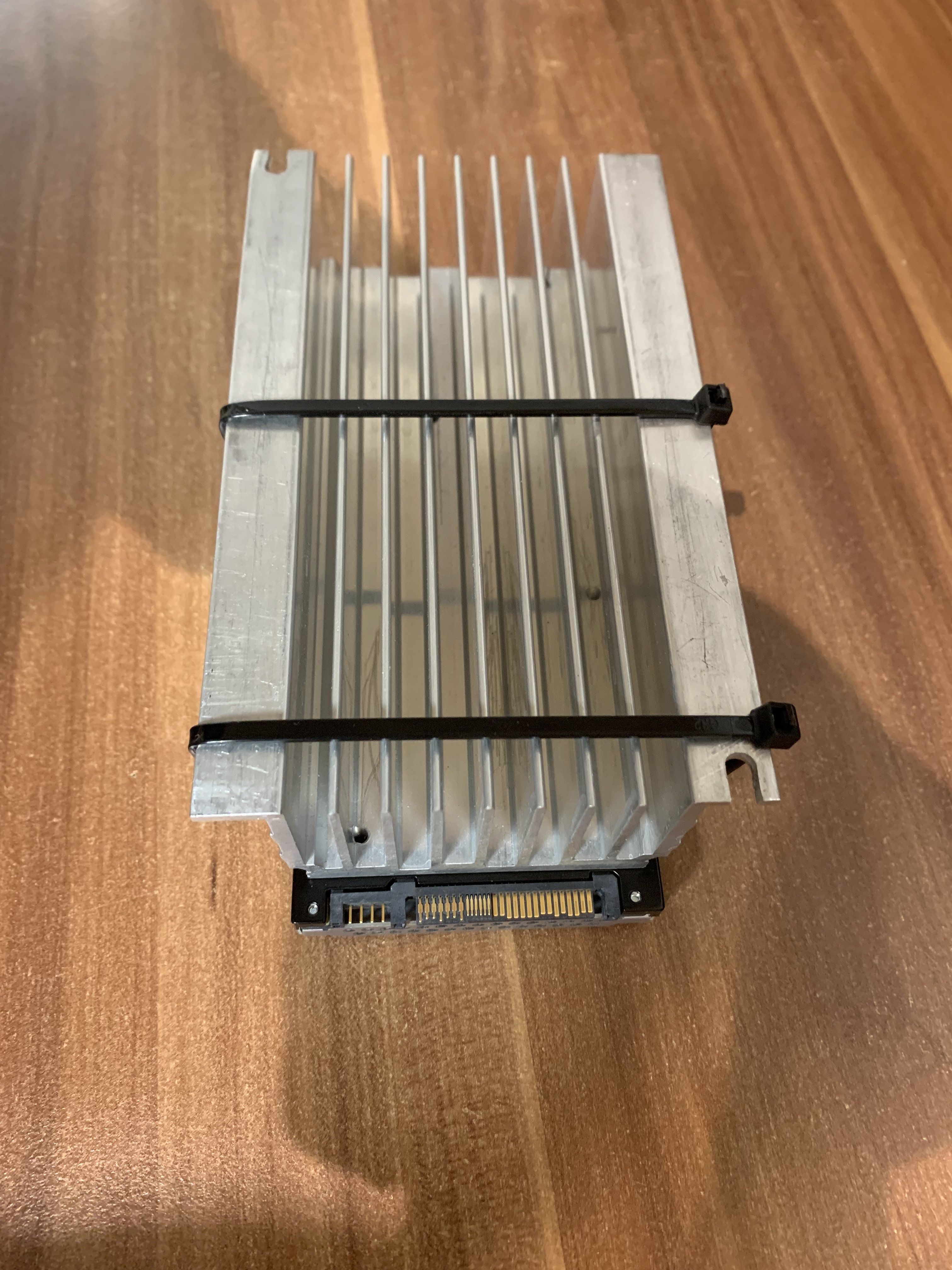 Ein großer Alu-Körper, ein dünnes Wärmeleitpad das ich rumliegen hatte, zwei Kabelbinder und fertig ist die Kühlung. Das ist nicht elegant, dürfte aber auf Lebzeiten der SSD prima funktionieren.