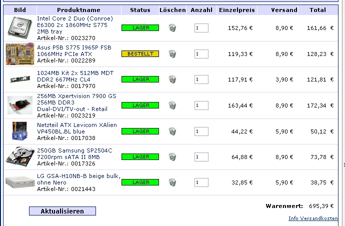 - gutes und stabiles Motherboard (SLI, guter Sound on board (HD wenn möglich) und sonstiger Standardkram wie Gbit Ethernet, etc.)