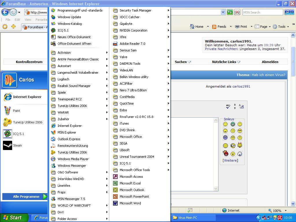 Ich benutze das Programm Antivir als Antiviren Programm und die Windows XP SP2 Firewall.