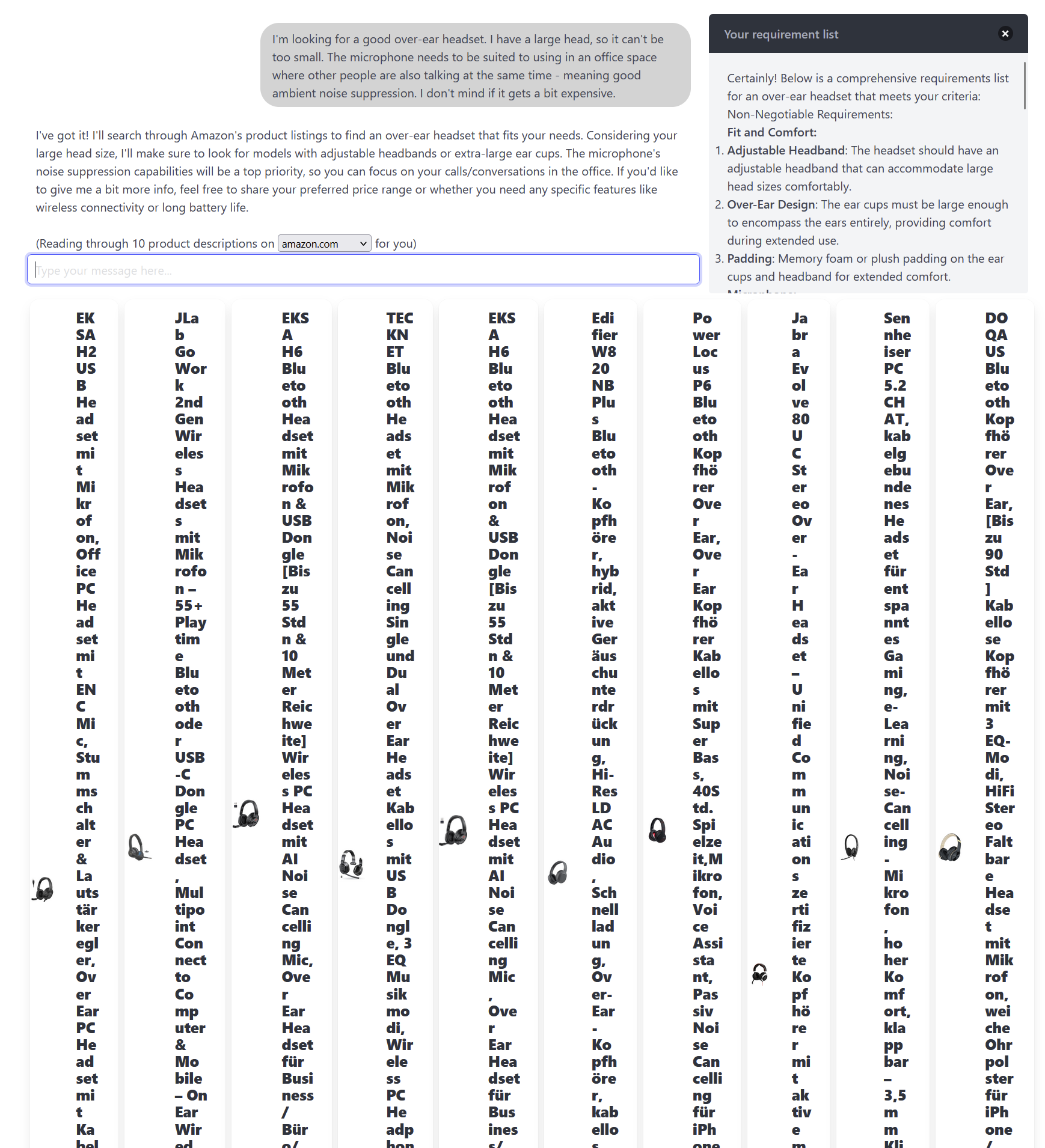 Man gibt in ein Chatfenster (wie bei chatGPT) ein was man benötigt und wofür. Es wird dann eine präzise und individuelle Anforderungsliste erstellt, welche von einer KI mit den regulären Suchergebnissen von Amazon abgeglichen wird. Zusätzlich habe ich einen weiteren Agent erstellt, welcher jedes Produkt darauf prüft ob es billiger china-Müll ist