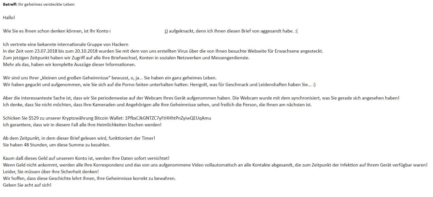 Einer davon bekam nun von sich selbst gesendet (user@unseredomäne.de) eine Warnungsmail, dass kurz gesagt sein Rechner einen Trojaner hat, das Mailkonto gehacked wurde und perverse Aktivitäten aufgenommen wurde und wenn nicht bezahlt wird (bitcoinkonto) wird es an alle Kontakte geschickt und der PC Inhalt gesperrt.