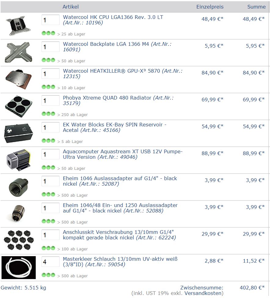 Zunächst mal meine Auswahl an Wakü-Komponenten. Schaut einfach mal drüber, ob es etwas zu verbessern oder ergänzen gibt -> siehe Anhang
