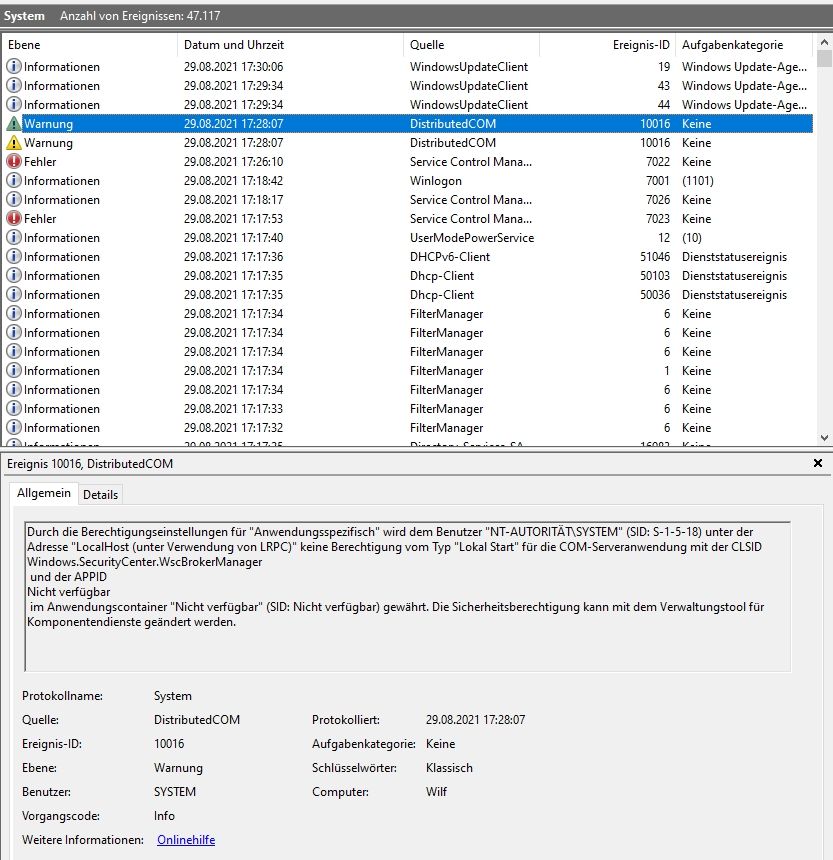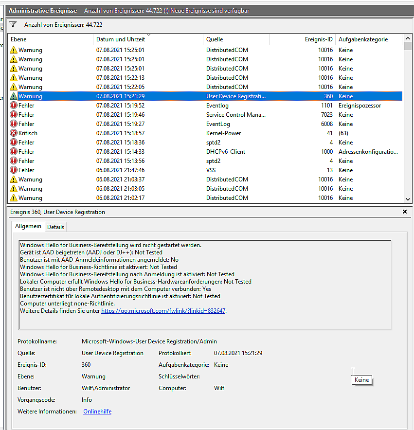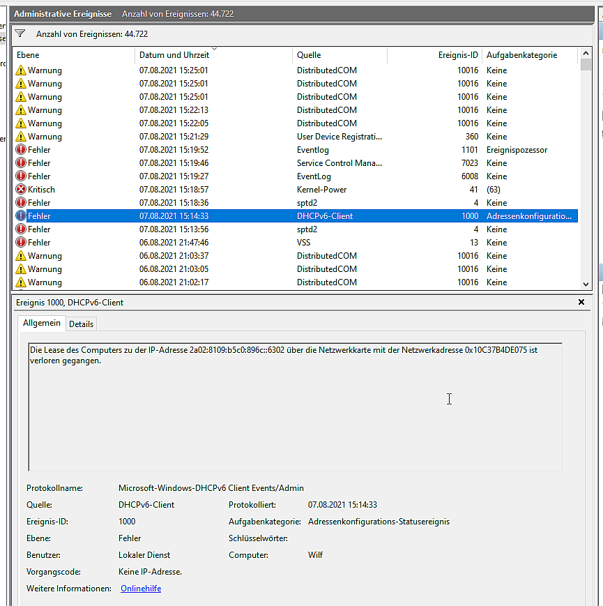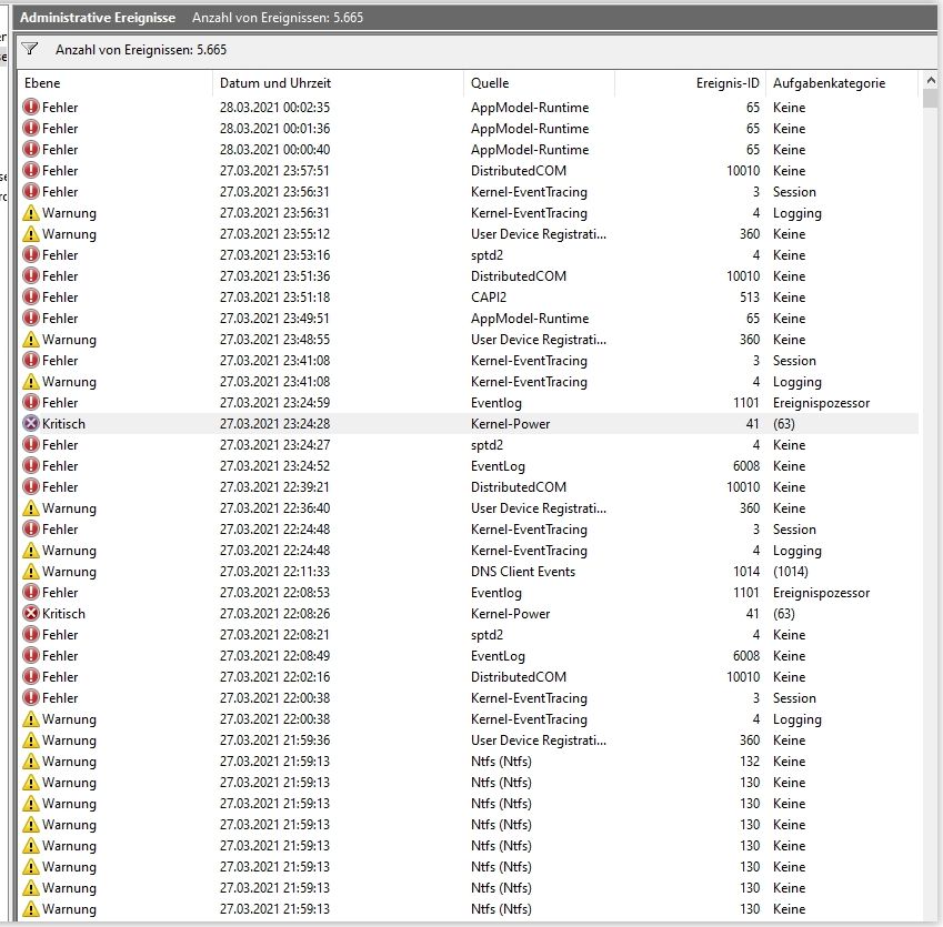 - Teils enthält die Absturz-/Neustartmeldung ganz falsche Uhrzeiten - manchmal mehrere Minuten FRÜHER als in der Ereignisanzeige selbst