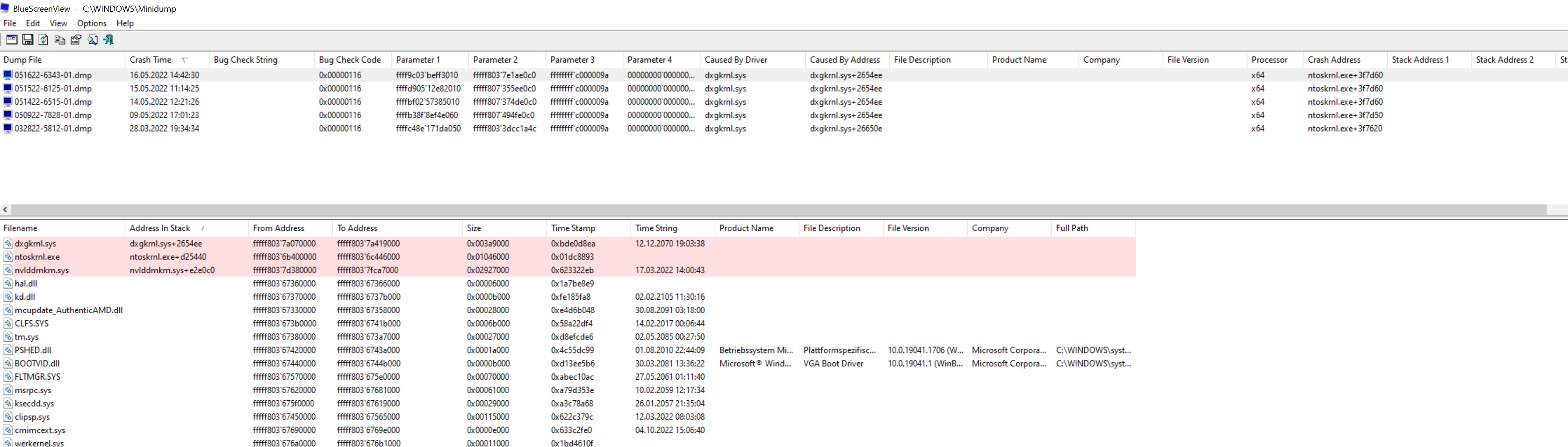 BlueScreenViewer benutzt. Dieser zeigt auch Einträge an, welche sich wohl auf den Grafikkartentreiber beziehen. Allerdings wird nicht bei jedem Absturz solch ein Eintrag generiert, nur ab und an. Ich frage mich, ob das Hängen bleiben davon ausgelöst wird, oder ob der Crash am Ende natürlich auch Fehler am Treiber auslöst. Ich hänge in jedem Fall mal einen Screenshot des BlueScreenviewers an.