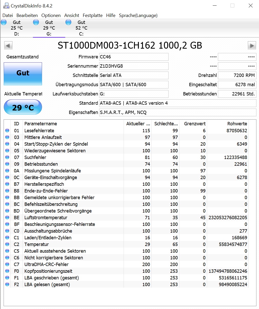 Habe natürlich auch die Festplatten im Verdacht. Allerdings zeigt CrystalDiskInfo keine Auffälligkeiten. Dennoch hänge ich euch mal die Screenshots an von jeder Platte.