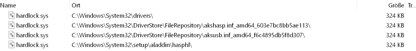Ich habe die erste und vierte hardlock.sys umbenannt; die beiden unter Driverstore konnte ich nicht umbenennen ("Sie müssen die erforderlichen Berechtigungen von "SYSTEM" erhalten, um Änderungen an diesem Ordner durchführen zu können.").