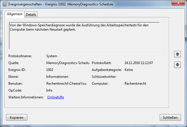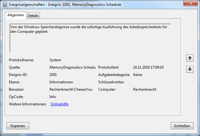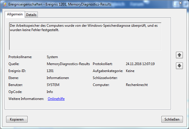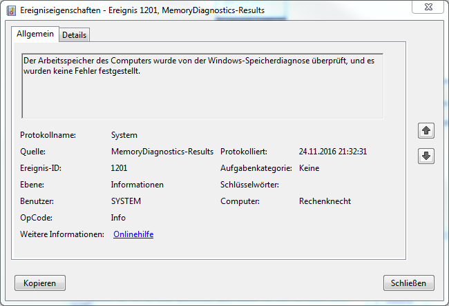Für den Arbeitsspeicher habe ich die "Windows"eigene Speicherdiagnose benutzt. Dabei wurden weder beim Standard-Test noch beim erweiterten Test mit aktivem Cache irgendwelche Fehler festgestellt.