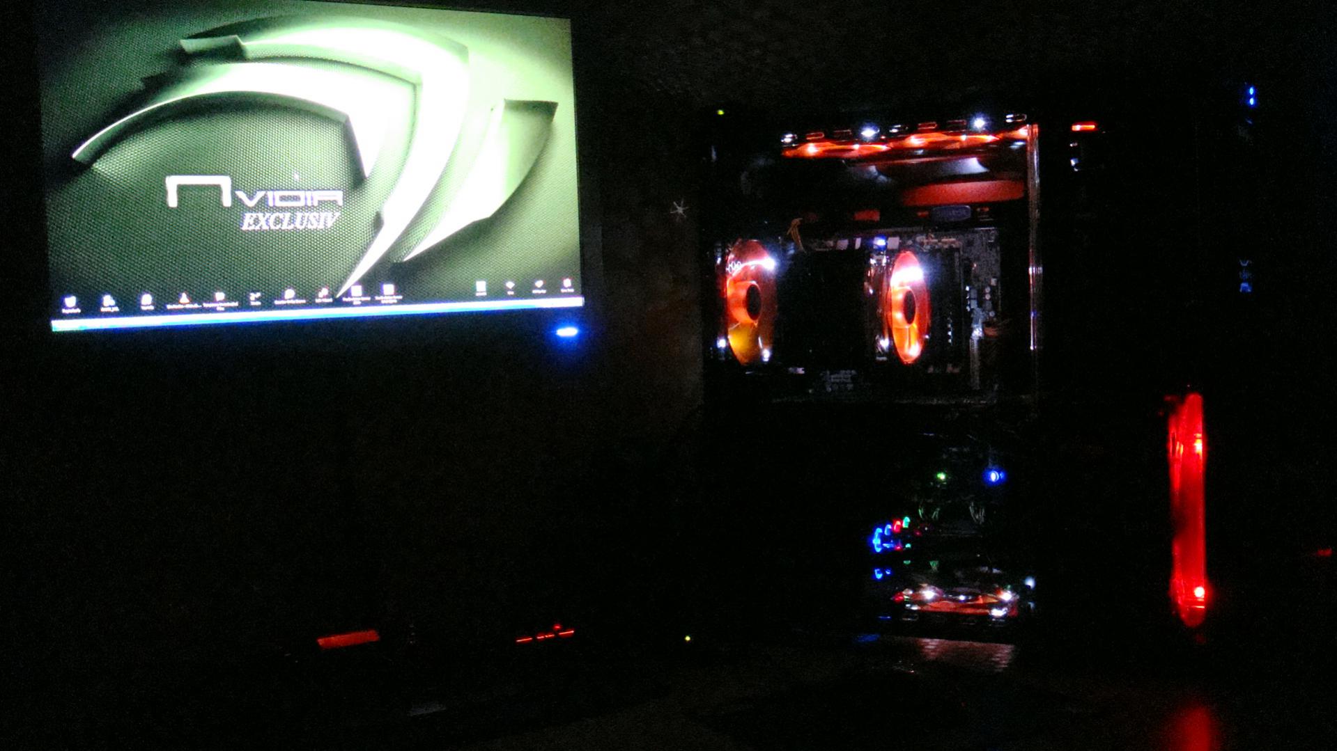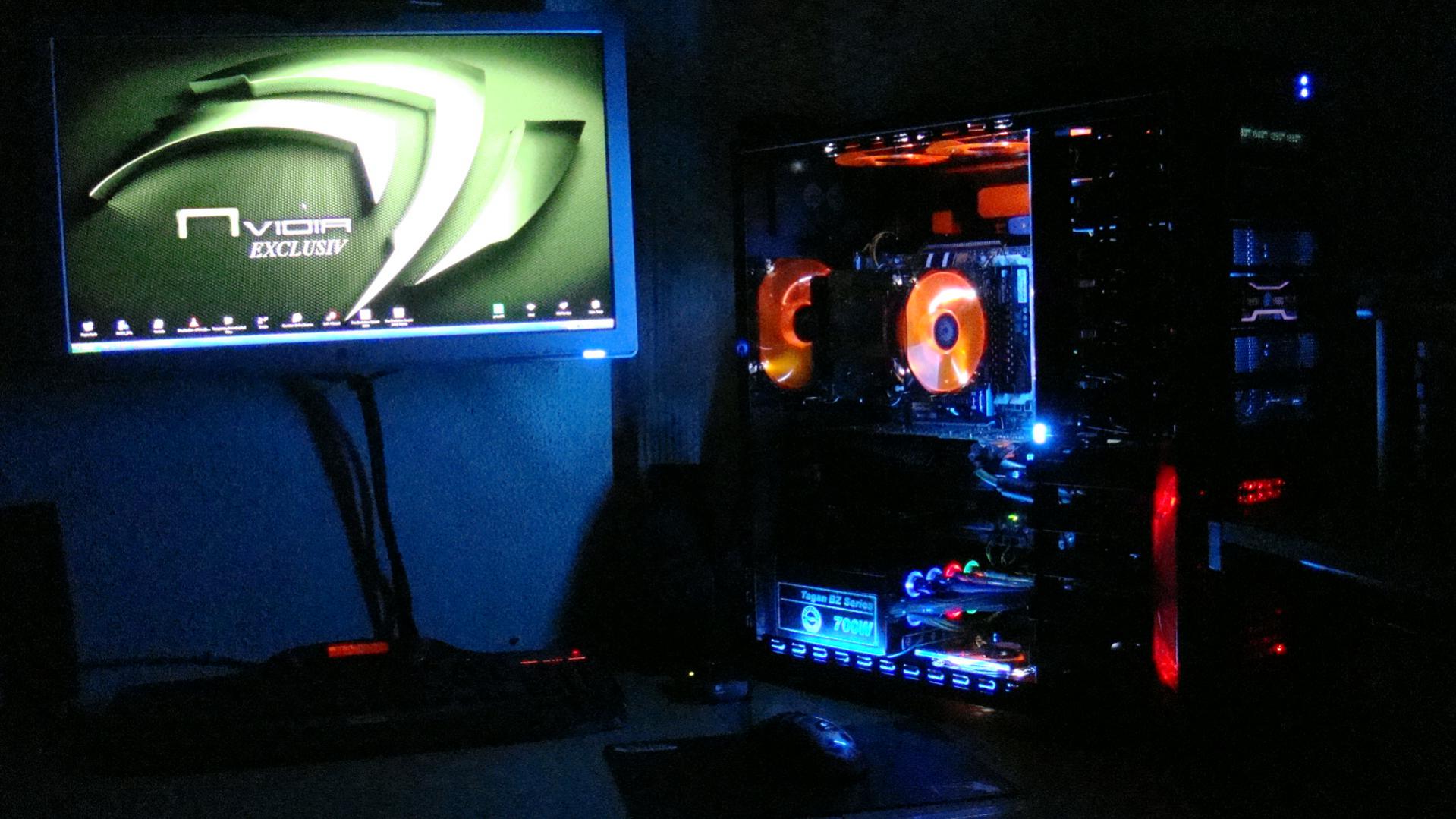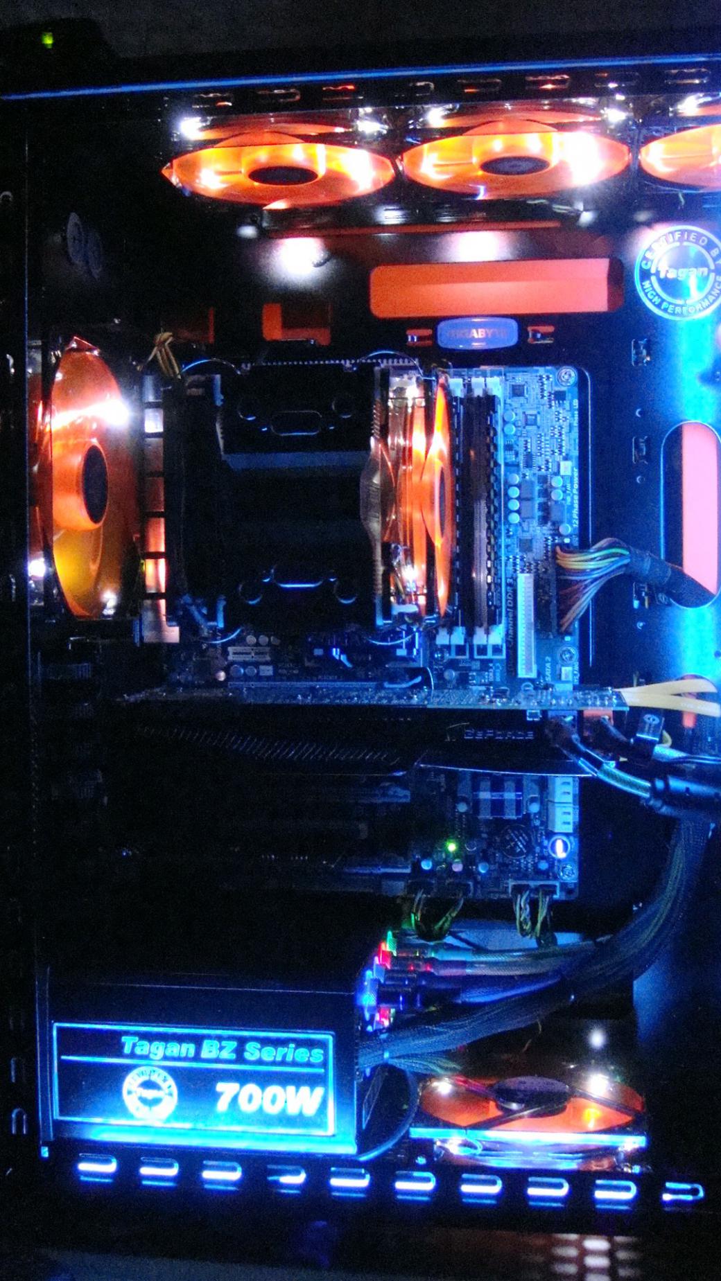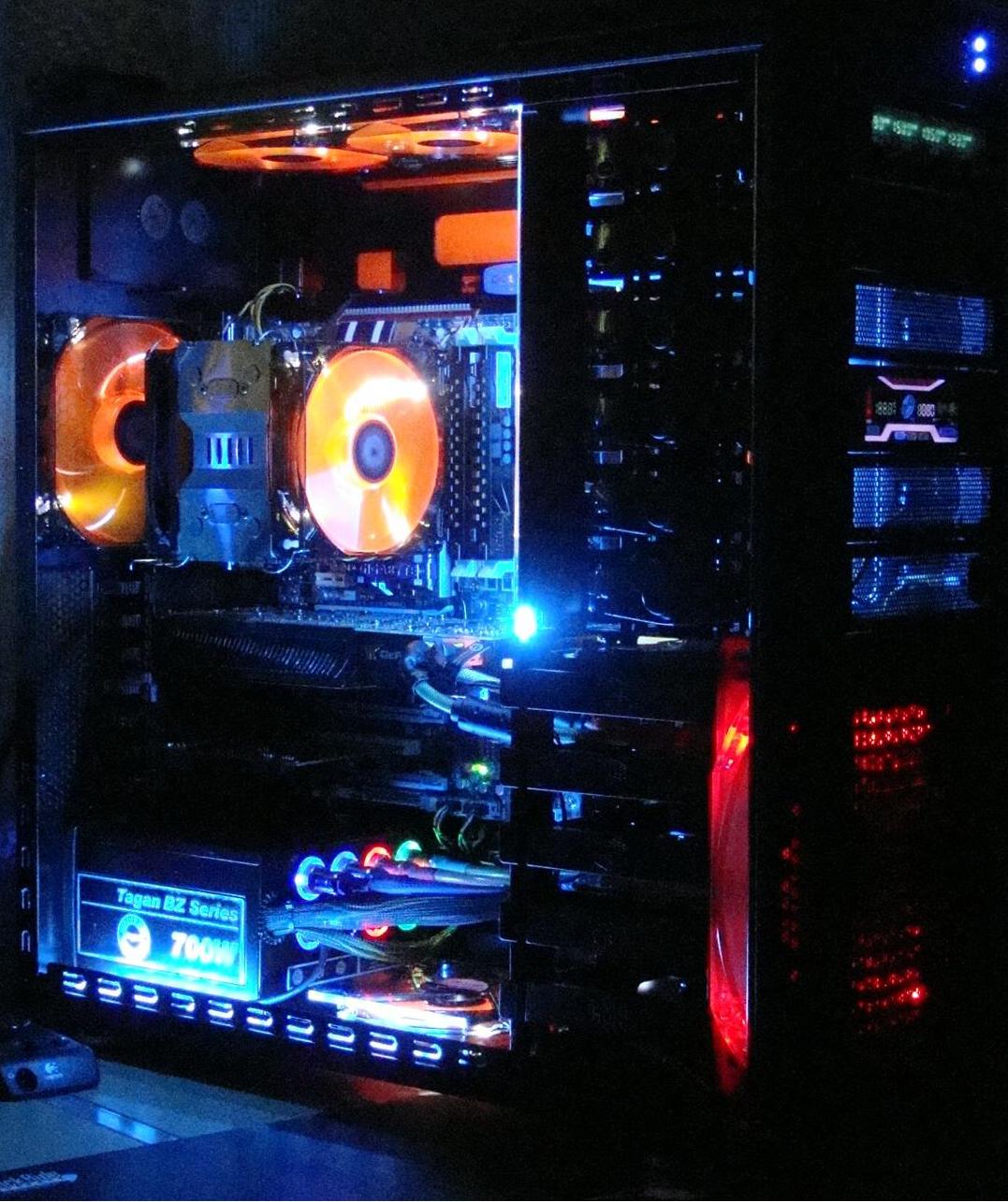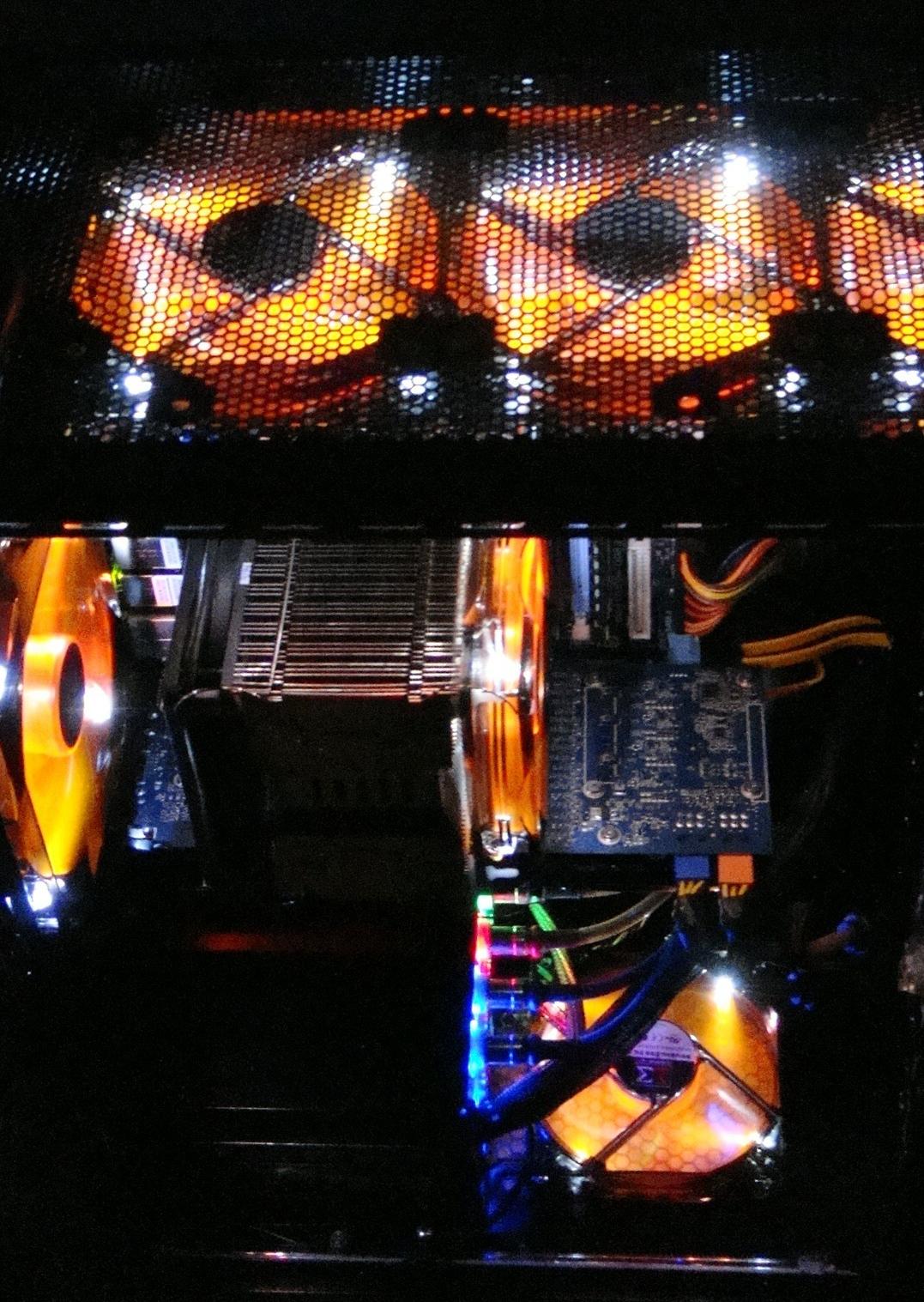 In der Front ein 120 Revoltec Dark Blue am Cpu Kühler Revoltec dark red und das Nt noch Rot Led.