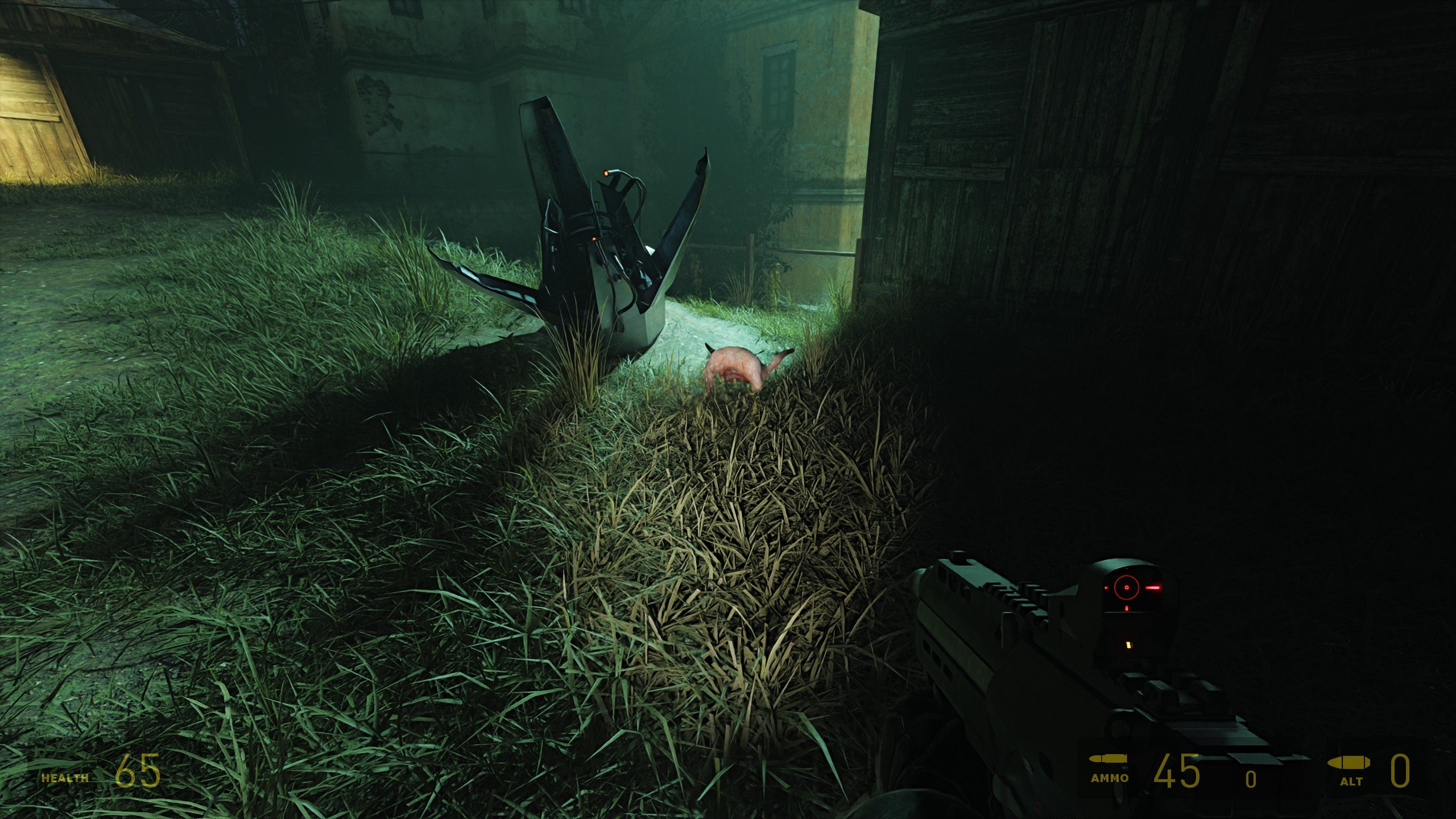 Gerade hier im Beispiel, wo der Ravenholm Level komplett bei Nacht spielt und man gegen die Headcrap-Zombies keine Munition hat und fast nur mit Taschenlampe rumläuft und mit der Gravity Gun mit Objekten auf die Zombies schießt, fällt das die ganze Zeit sehr deutlich auf.