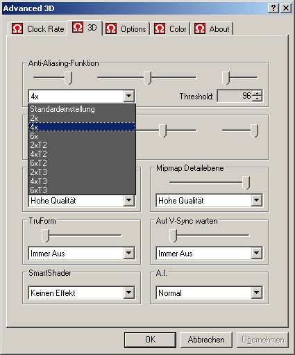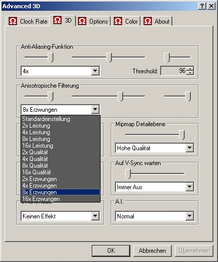 Vorweg gesagt : ich dachte immer , wenn man im Treiber die Einstellungen für AA/AF auf Standardstellungen stehen hat , richtet sich alles nach den einstellungen in den Spielen . Ich für meinen teil hatte im omegatreiber ( auf welchen ich gleich noch zu sprechen komme ) AA und AF auf "Standardeinstellung" stehen . Ergo dachte ich , die von mir getätigten Einstellungen in Hl2 ( 4xAA / 8xAF ) wäre das gleiche , als ob ich 4xAA / 88xAF im Treiber direkt eingestellt hätte .