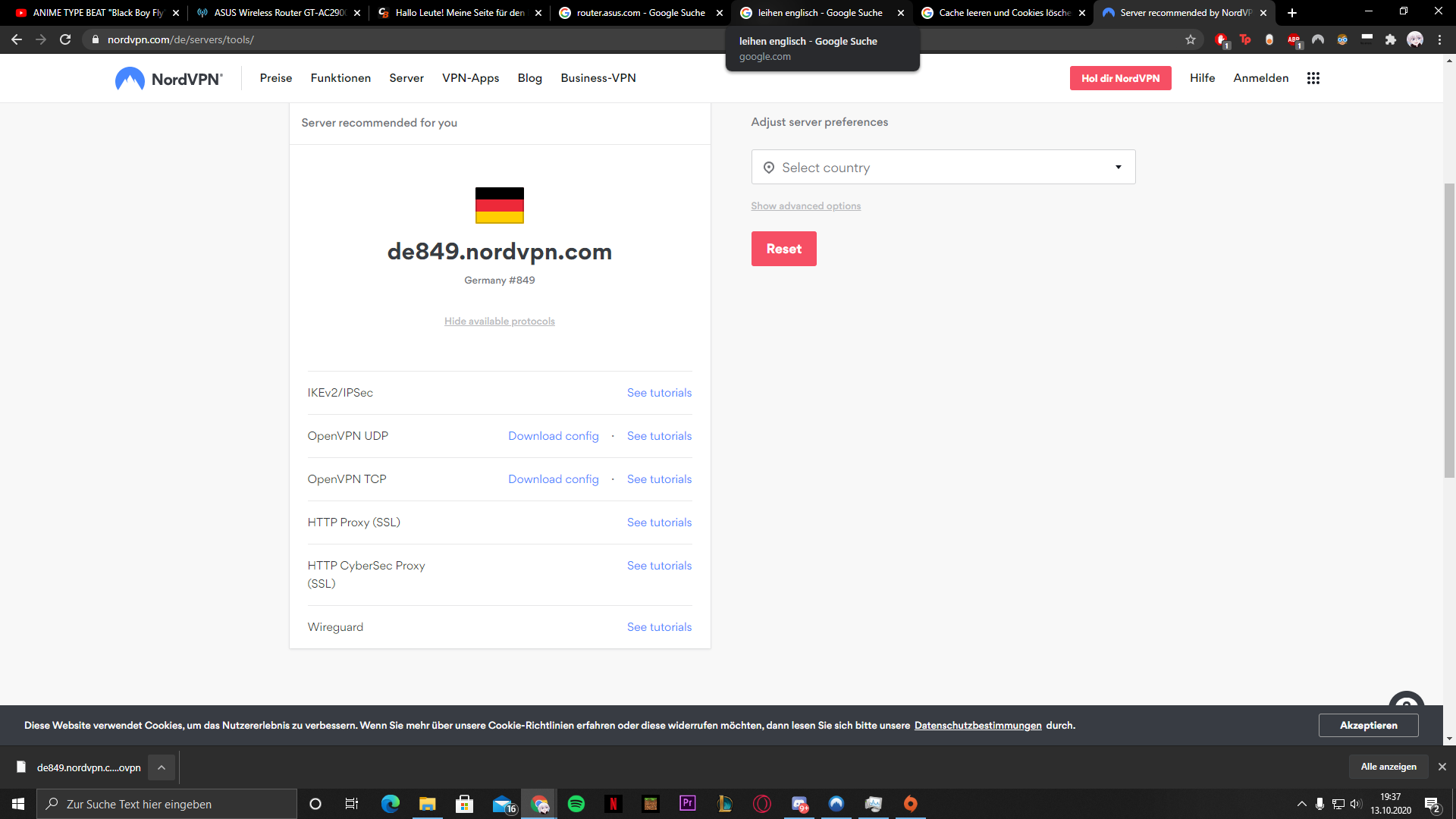 Asus rog 2900 es geht um eine open vpn udp datei https://nordvpn.com/de/servers/tools/ hier der link nach ganz unten scrollen und dann auf besten server finden dann show available protocols hier ein foto