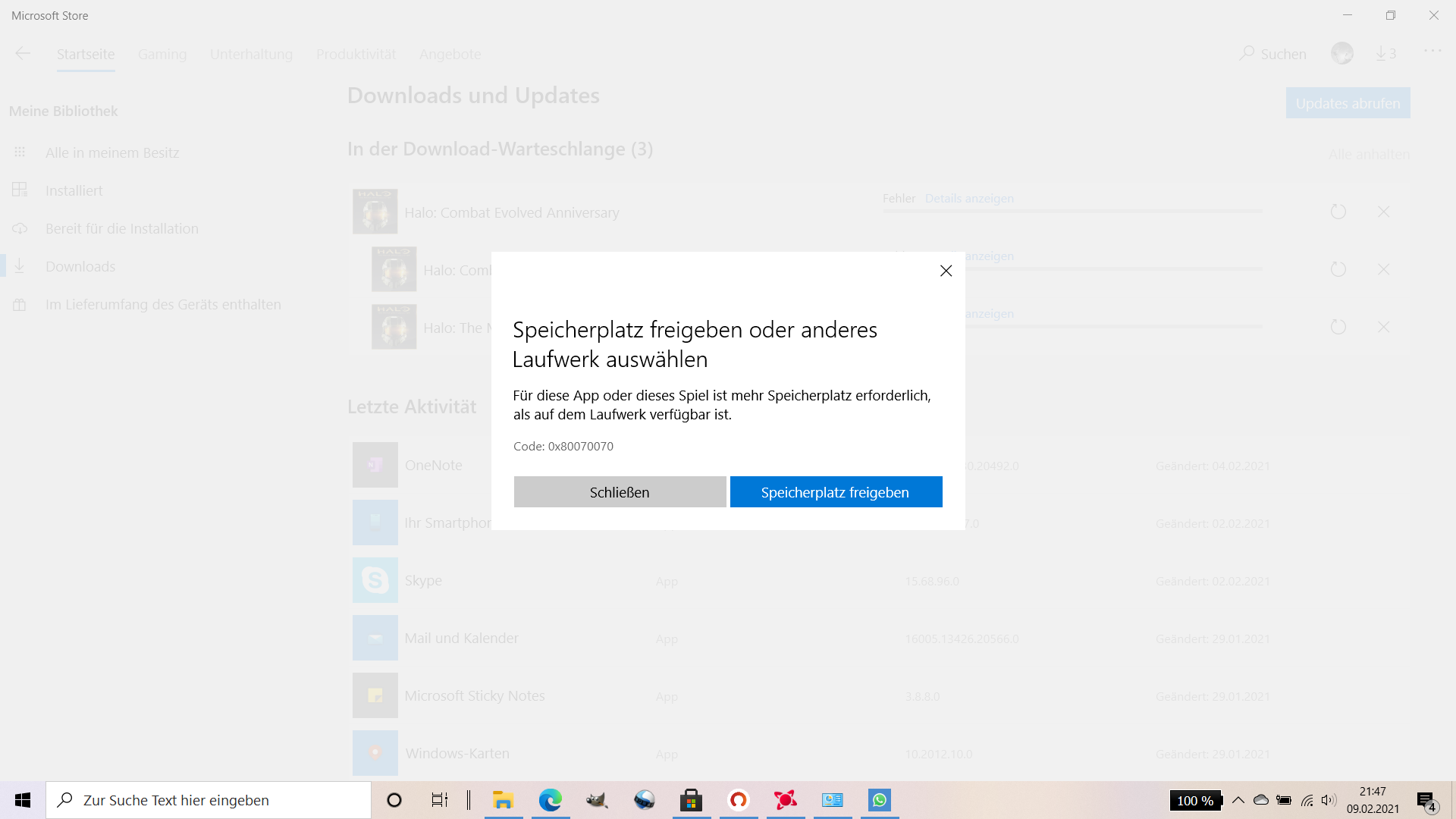 Ich habe mir gerade Halo: Combat Evolved Anniversary über den Microsoft Store gekauft. Nun kommt bei der Installation die Fehlermeldung, ich solle erstmal Halo: The Master Chief Collection installieren. Das wiederum lässt sich nicht installieren, weil zu wenig Speicherplatz verfügbar ist.