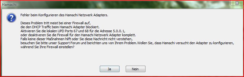 Ich will Hamachi auf meinem Vista Laptop zum laufen kriegen aber da kommt immer eine Fehlermeldung. Hab versucht die Firewall mal komplett auszuschalten. Aber auch das hat nichts gebracht beim Einrichten gibt es die Hehlermeldung.