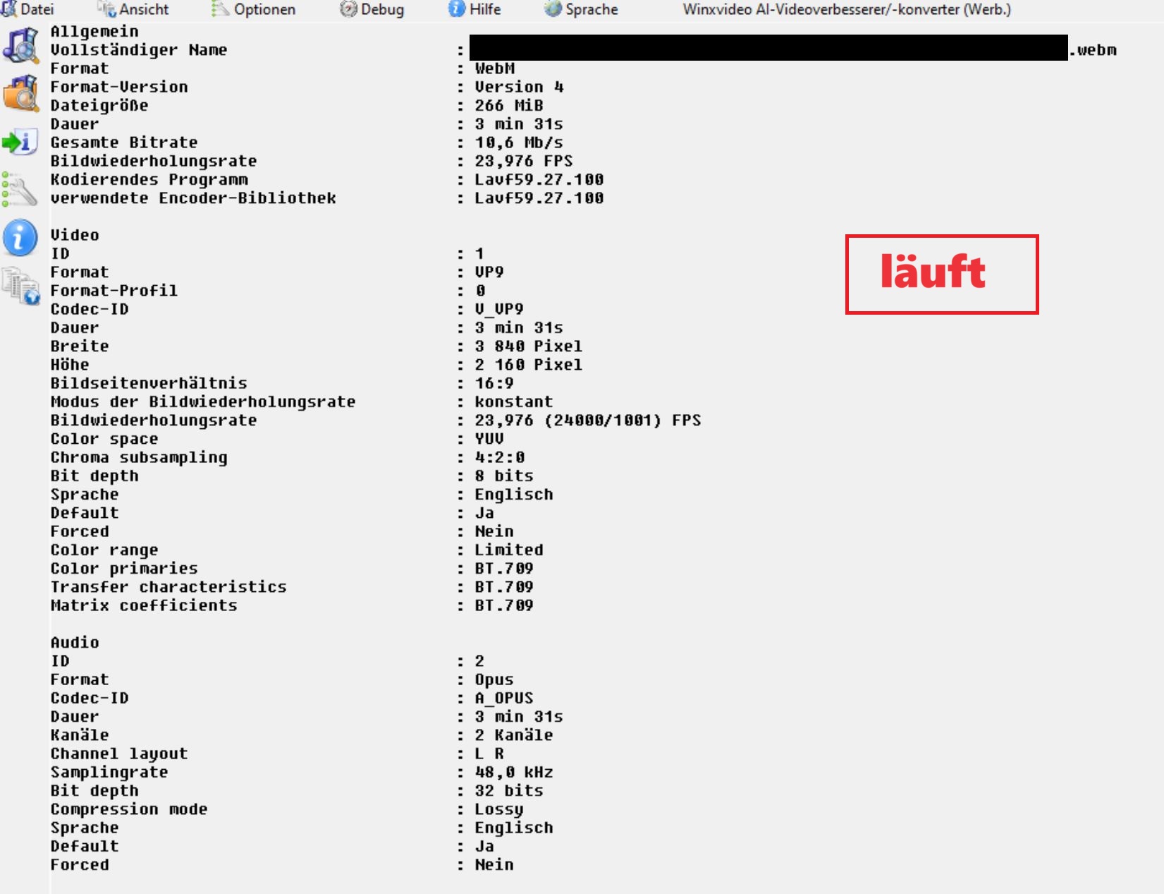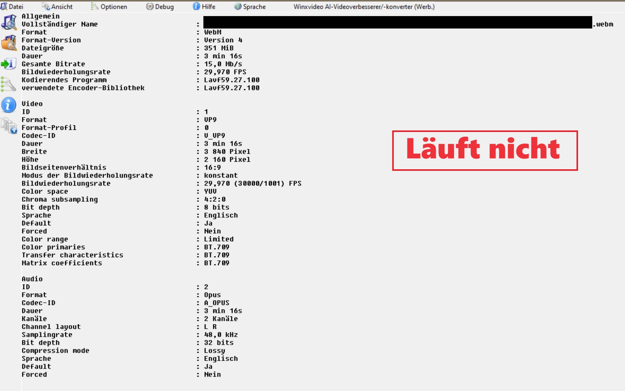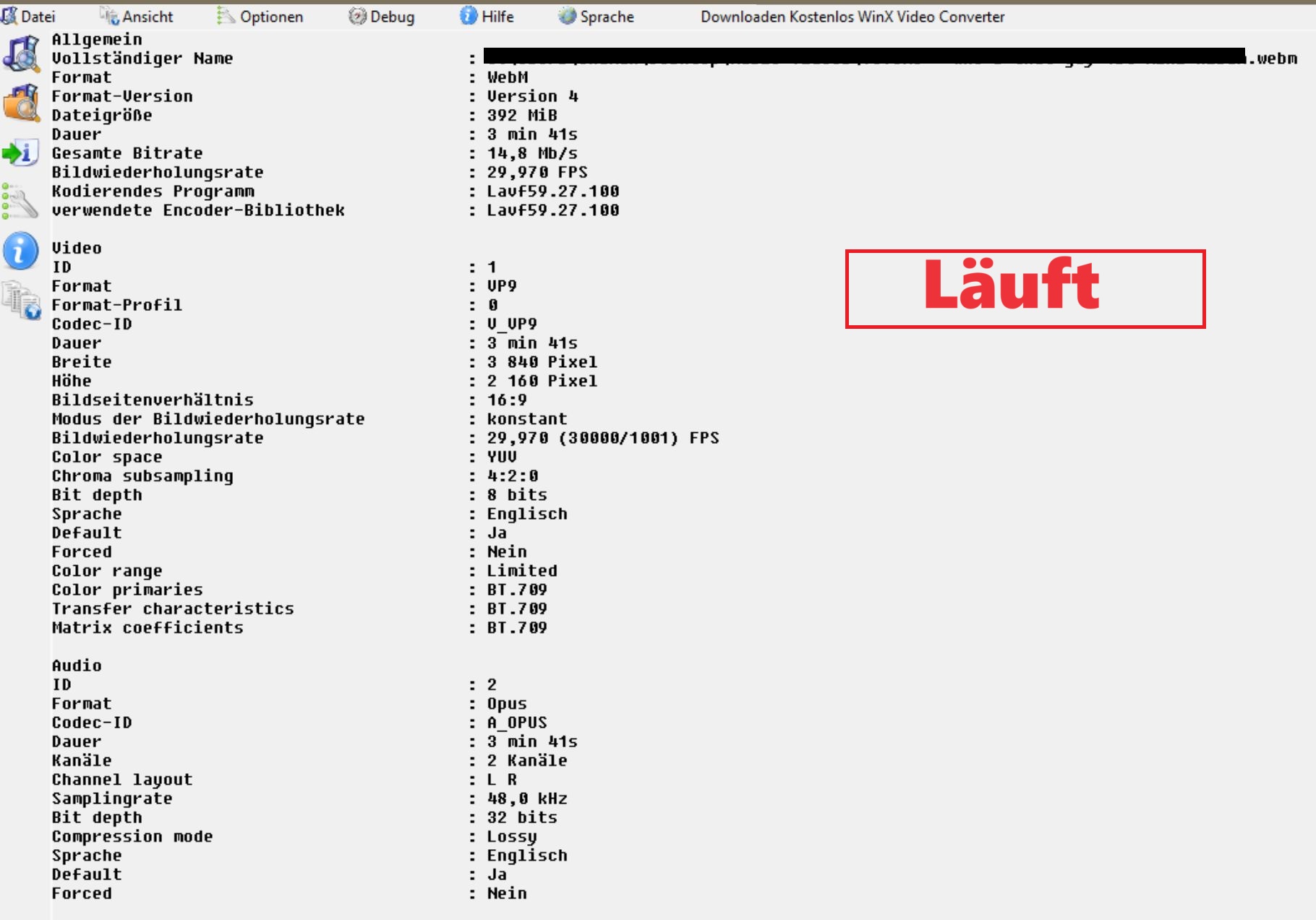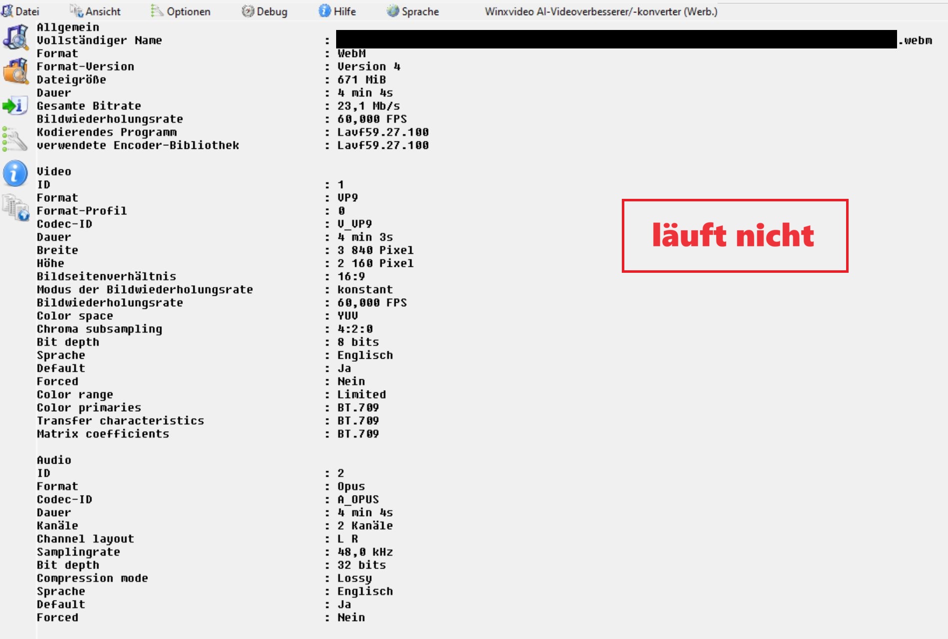 Kann mir jemand sagen, was ich bei dem Programm einstellen muss, um die 4k Videos reibungslos auf RP5 laufen zu lassen? Hier sind 4 Screenshots mit den Informationen zu den Videos. Die Infos hatte ich mit MediaInfo erzeugt. Vielleicht gibt es eins, was mehr zeigt?