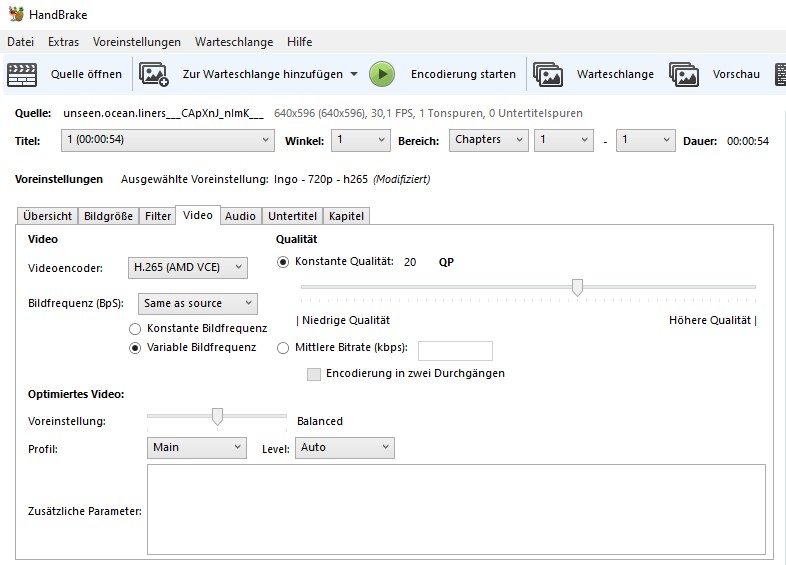 Hab durch den Thread hier zum ersten Mal von AMD VCE gehört und gestern direkt mal ausprobiert. Es geht ca. 10x schneller wie vorher, allerdings habe ich ein Problem. Das hier ist meine ursprüngliche Einstellung für h265.
