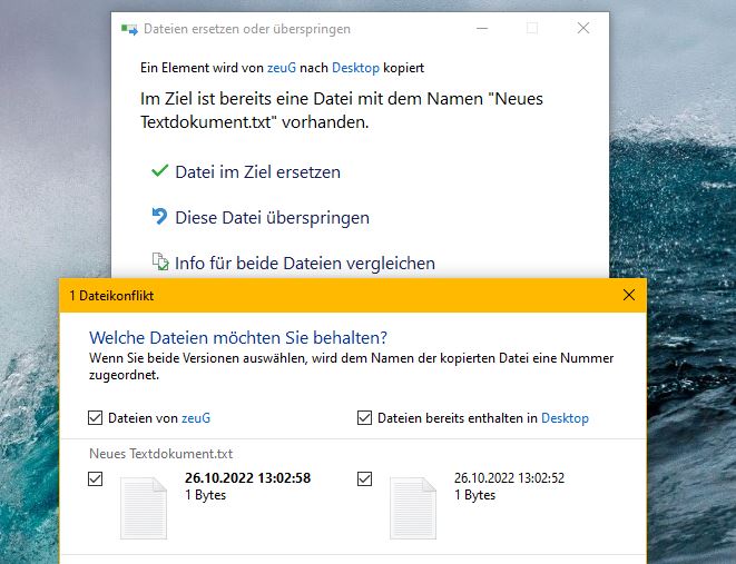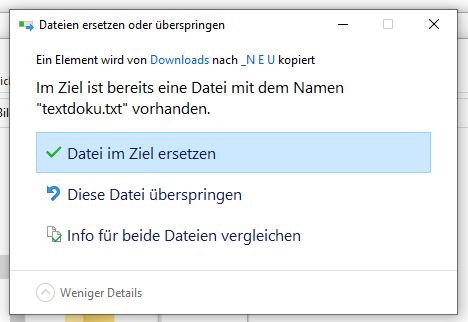 Also wenn ich eine Datei gleichen Namens in einen Ordner kopiere/verschiebe, wo eine gleichnamige vorhanden ist, wurde früher nebst dem ersetzen/überspringen auch das Duplizieren angeboten. Dies geschah nach Anhaken der Option automatisch mit einem "(x)" im Dateinamen.