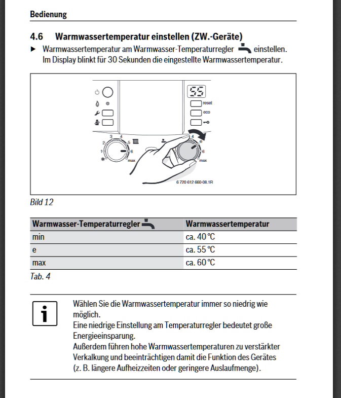 Die Schaltschwelle (wenn anpassbar) sollte den Nutzungsgewohnheiten angepasst werden. Wenn ihr sehr viele Wasserwechsel im Intervall habt, kann die Schaltschwelle auch gerne etwas niedriger ausfallen, damit der Brenner nicht ganz so häufig anlaufen muß. Eine Differenz von 5°K zum Sollwert st zumindest mal ein guter Anfang.