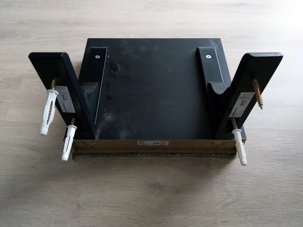 Unten drunter je 2 Winkel, Ideal aus Metall. Die Winkel die du oben verlinkt hast passen da schon. Zwecks einschrauben: Einfach mal den Schraubendreher statt des Akkuschraubers nehmen
