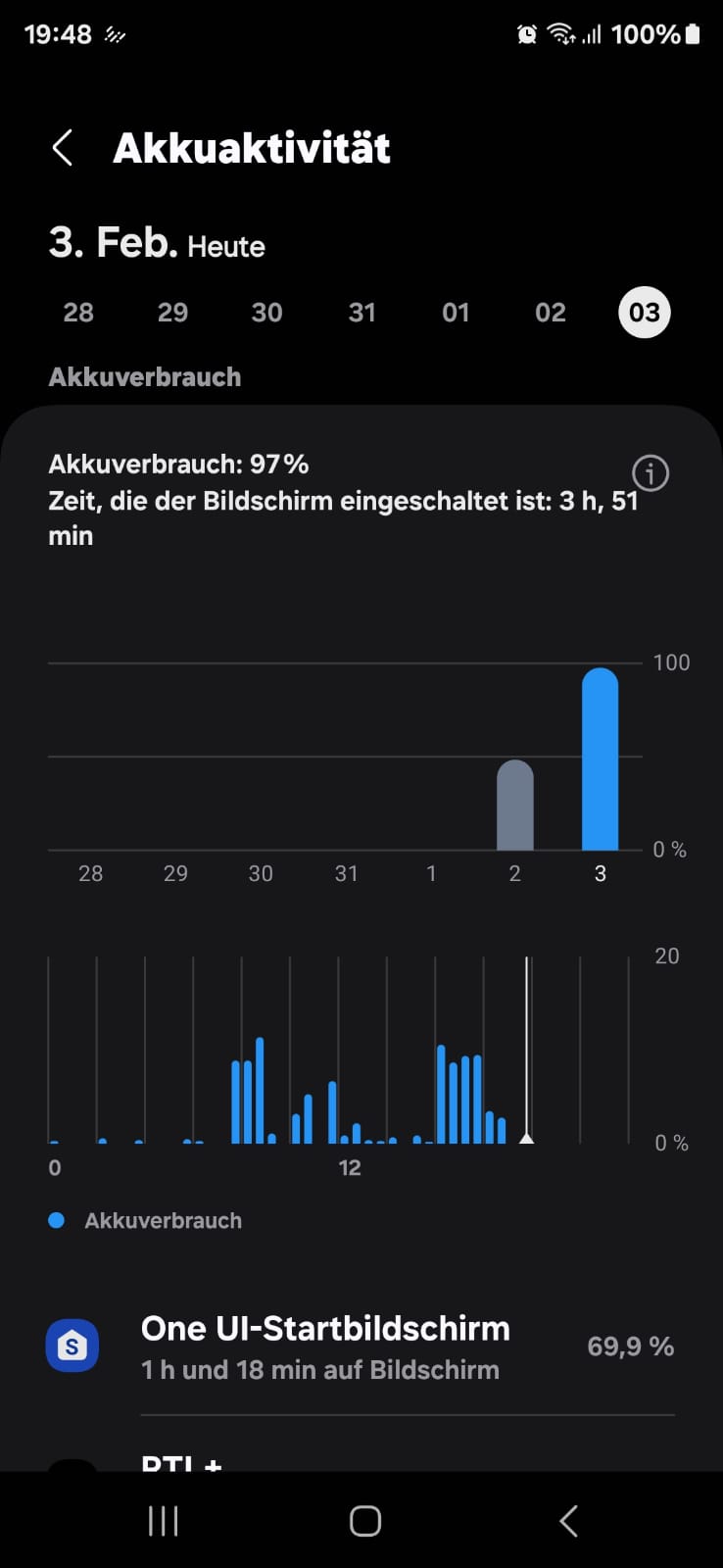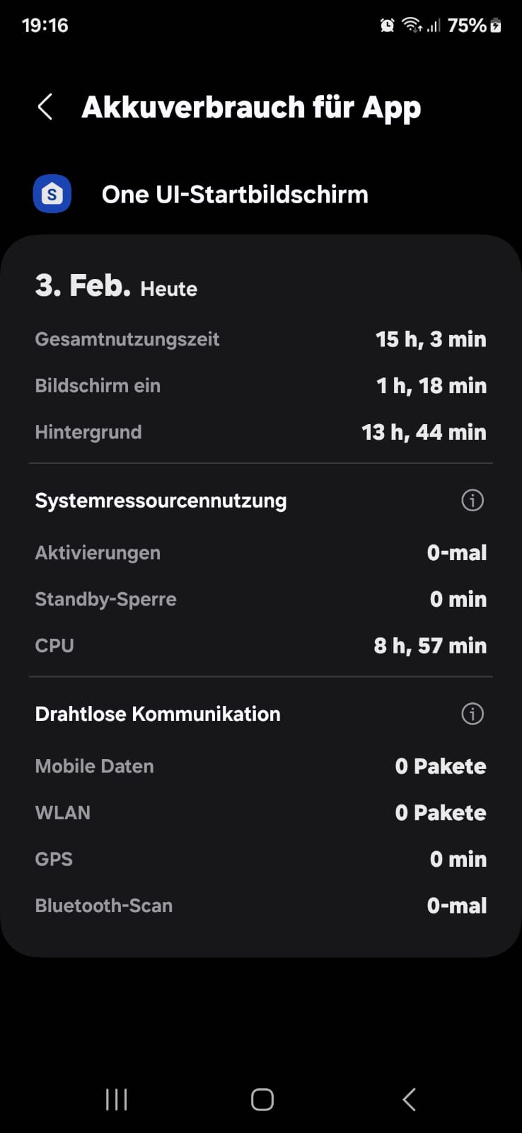 Ein Blick in den Akku Einstellungen ergab das one ui startbildschirm über den Tag 69 Prozent akku verbraucht und die CPU fast den ganzen Tag aktiv ist !