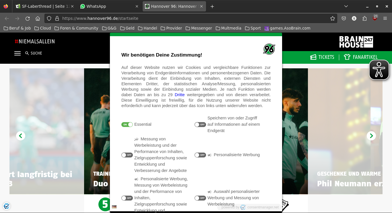 gehe ich auf die Hannover 96 Seite https://www.hannover96.de/startseite so erscheint dort diese Cookies Abfrage, wie fast bei jeder Seite im www. Doch ich kann nicht bestätigen, ich kann nur die Regler off und on stellen, aber es gibt kein ok Button oder ähnliches. Ich kann auch nicht scrollen.