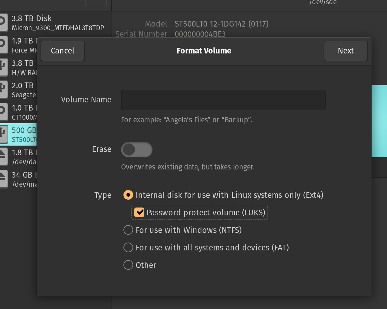 - Ich hab unlängst an meinen Rechner eine neue Festplatte für Sicherungen angeschlossen. Unter Windows hätte ich das mit Bitlocker abgefackelt. Hier war's cryptsetup luksFormat, cryptsetup luksOpen, mkfs.ext4, mount, Keyfile mit dd erstellen dann die /etc/crypttab und die /etc/fstab bearbeiten damit das Einhängen automatisch mit dem Rechner geschieht. Das lässt sich sicher auch mit einer GUI machen, aber definitiv umständlicher als unter Windows.