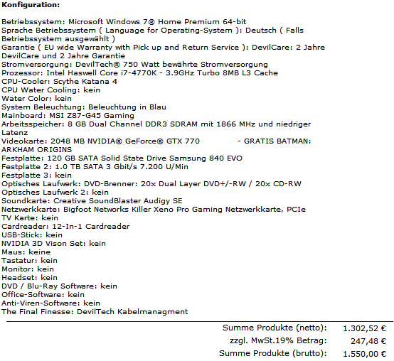 Ich habe bereits einen PC auf Deviltec zusammengestellt und wollte Fragen ob jemand verbesserungvorschläge hat oder einen günstigeren anbieter
