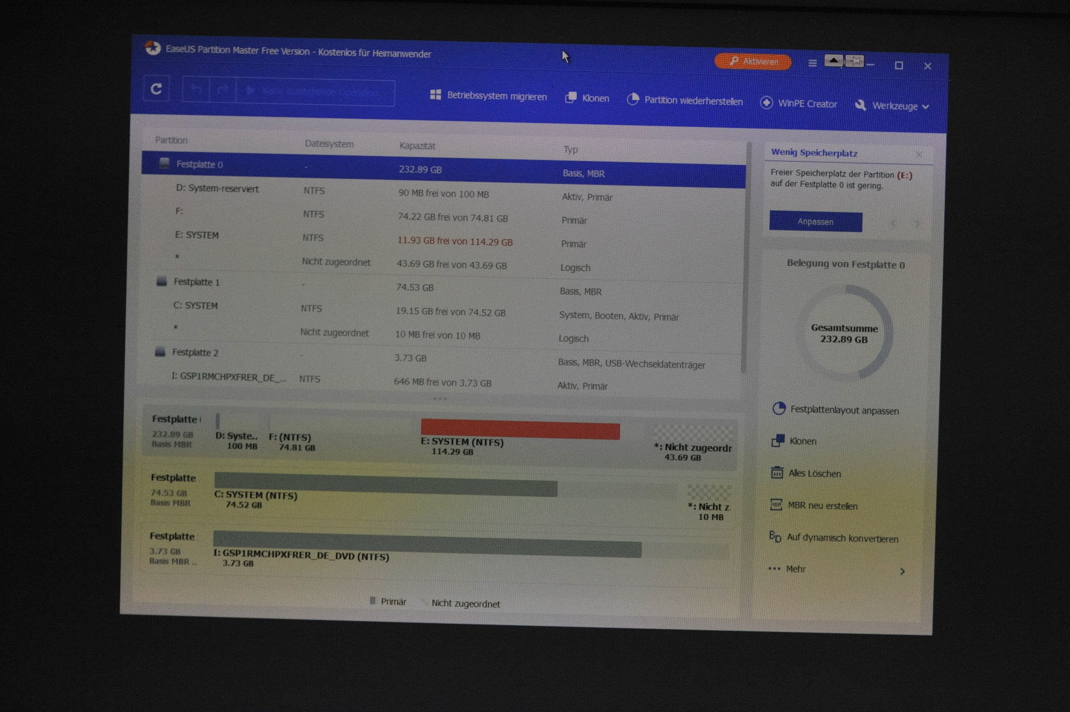 Oder zwecks Kontrolle einfach nochmal das W7-Setup bis in die "Partitionsverwaltung" aufrufen und dort die jetzt vom Setup-Prozess erkannten Partitionen des Datenträgers prüfen - dann weiß man's sicher, wie viele und welche definierten Partitionen vorhanden sind!