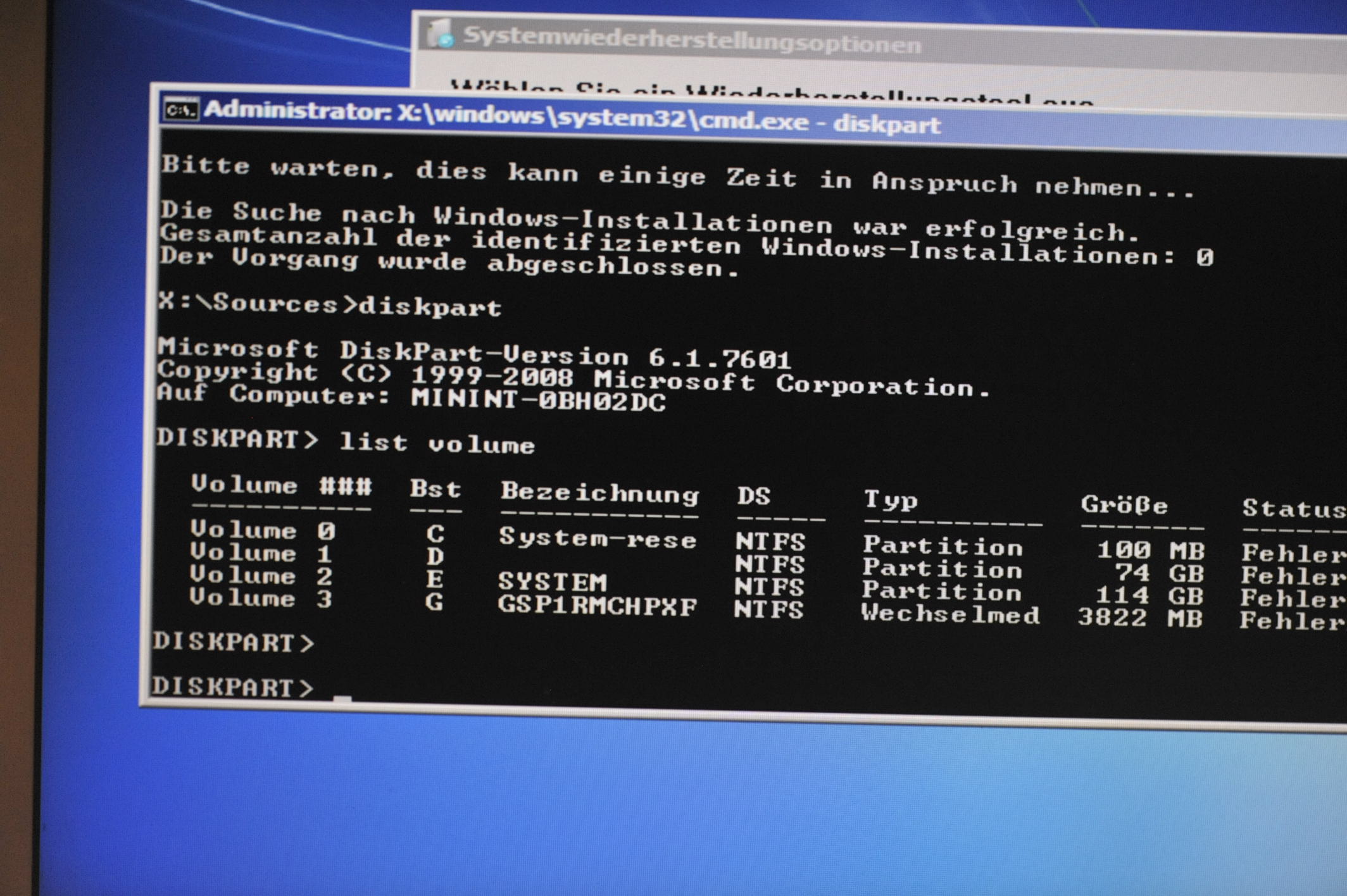 Volume Z schrieb:Ermittle mit Diskpart den Laufwerksbuchstaben von Partition 3/Windows/114 GB.