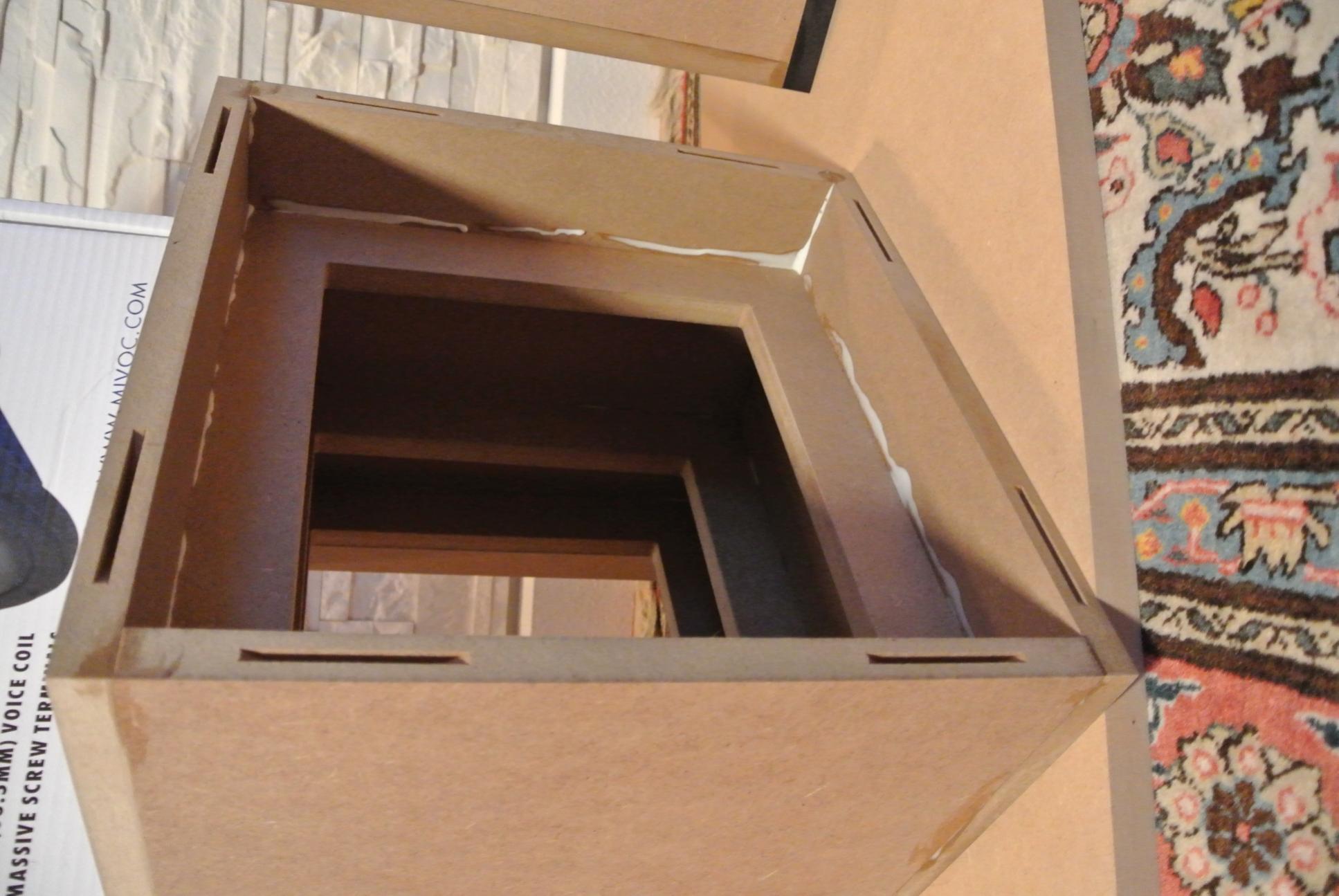 Die Bauaufsicht ist besonders wichtig wenns gelingen soll Ansonsten ist alles auf Stoß verleimt, die Front und die Rückseite in schwarzem MDF. Chassis wurde eingefräßt und die 4 Bohrungen auf der Rückwand sind für die Polklemmen. Ich habe 4 gesetzt und diese intern parallel verschaltet. So kann ich später die Woofer entweder parallel oder seriell schalten ohne eine Klemme doppelt zu belegen.
