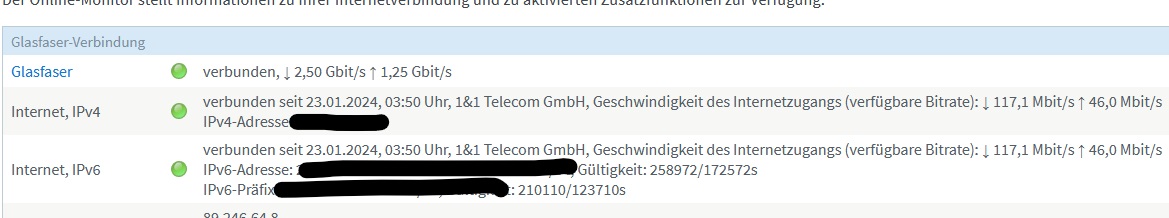 Die FritzBox schreibt unter "Online Monitor" IPv4 und IPv6 und für beides eine Bitrate von 49,8MBit/s Up- und 12,4MBit/s Downstream